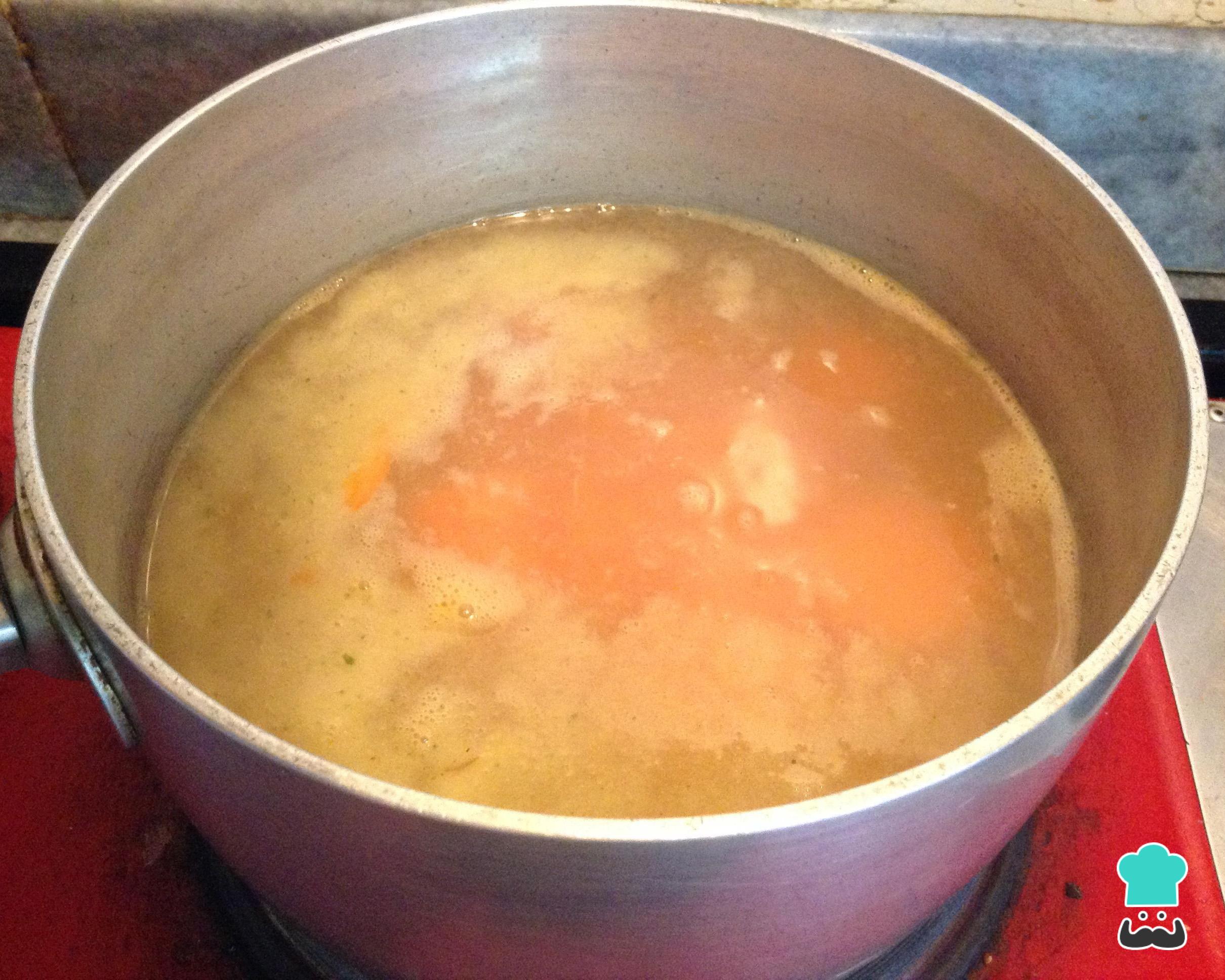 Adicione o caldo de galinha e as cenouras e deixe cozinhar durante 15-20 minutos, ou até as cenouras ficarem macias. Acerte o sabor com sal, depois desligue o fogo e deixe esfriar um pouco.