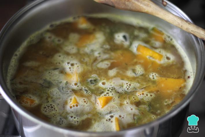 Enquanto isso, descasque a abóbora e corte em pedaços. Adicione ao refogado, misture e cubra com o caldo de legumes. Deixe cozinhar por 30-40 minutos, ou até a abóbora ficar macia.
