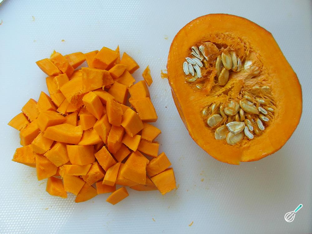 Lave a abóbora, corte fora as pontas e abra ao meio. Com uma colher retire as sementes, corte a abóbora em fatias e depois em quadrados. Pode descascar ou não, já que a casca é fina e comestível.