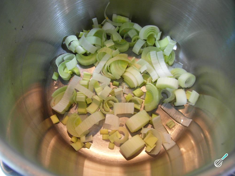 Lave o alho-poró e corte em rodelas. Leve ao fogo uma panela com o azeite e refogue o alho-poró até ficar transparente.