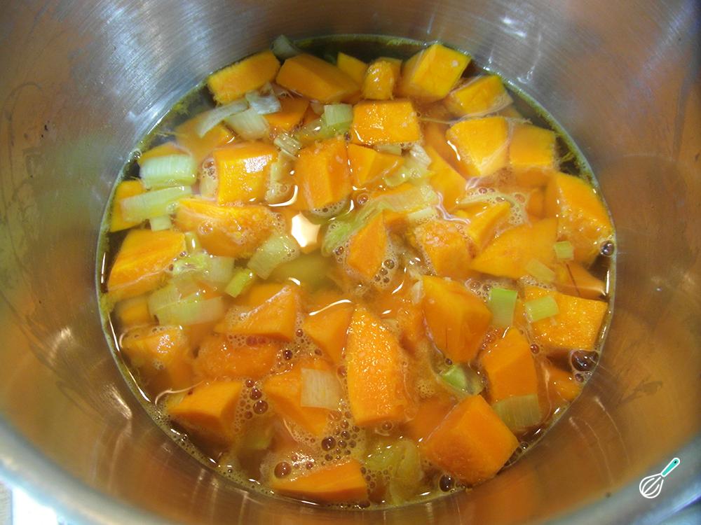 Acrescente a abóbora hokkaido, cubra com água e tempere com sal e cominhos. Tampe e deixe cozinhar por 15 minutos, ou até ficar macia.