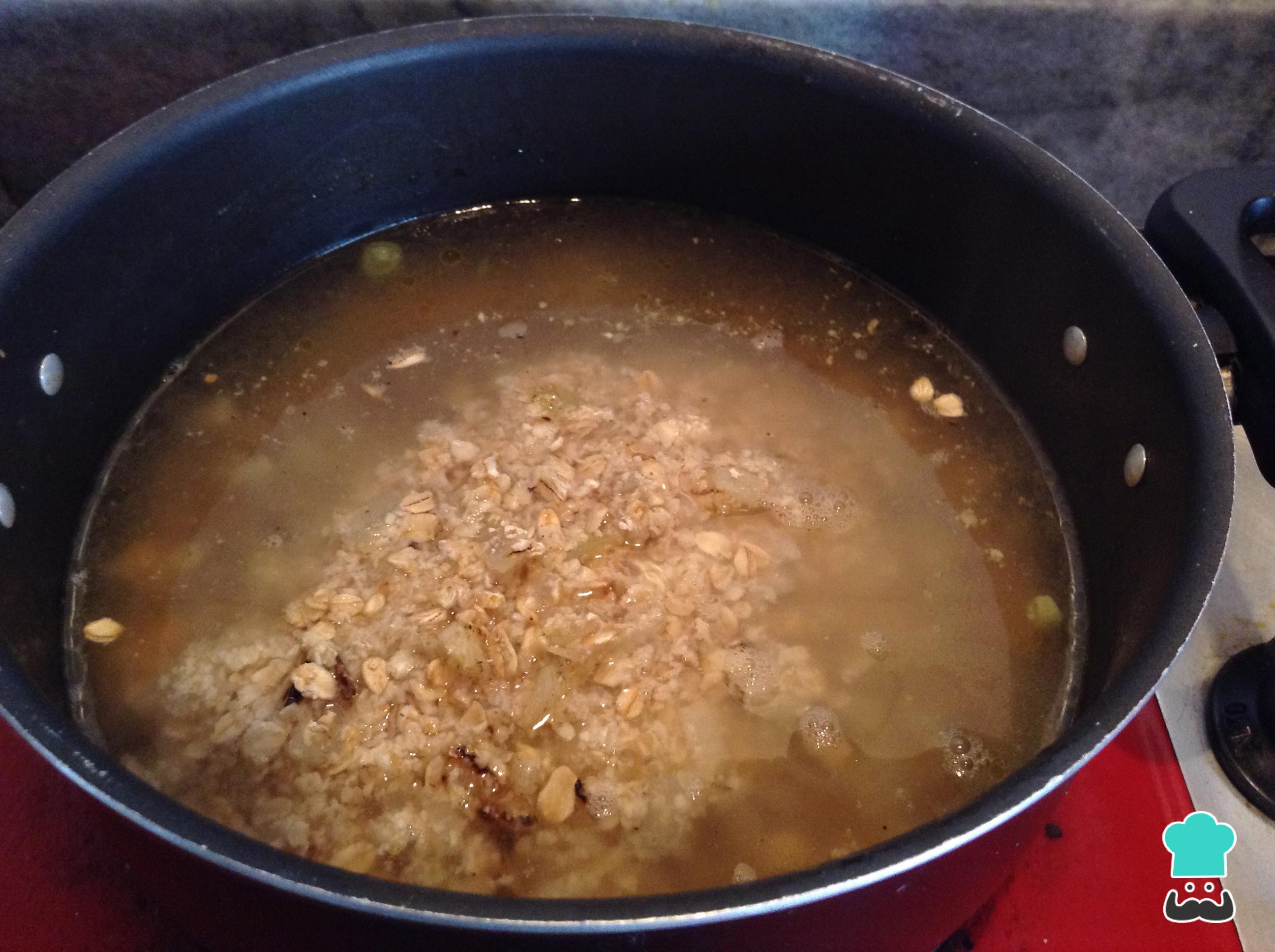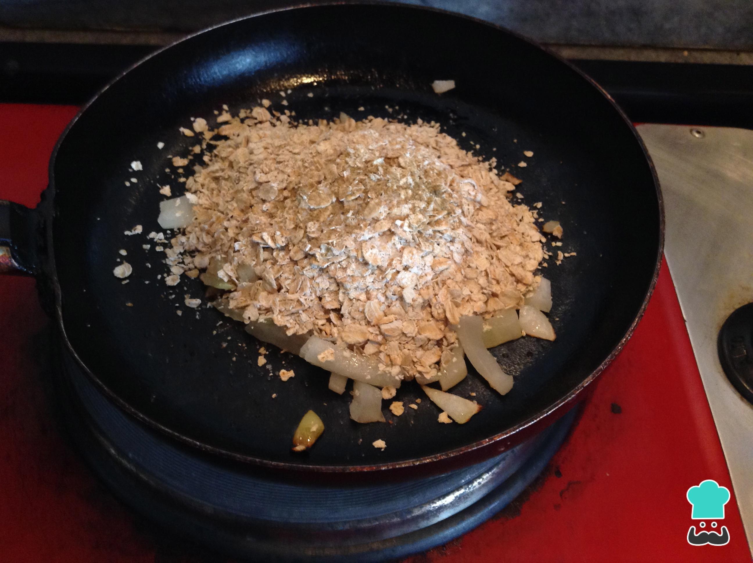Assim que a cebola estiver transparente, adicione a aveia e deixe cozinhar por mais cerca de 2-4 minutos. Desligue o fogo e reserve.