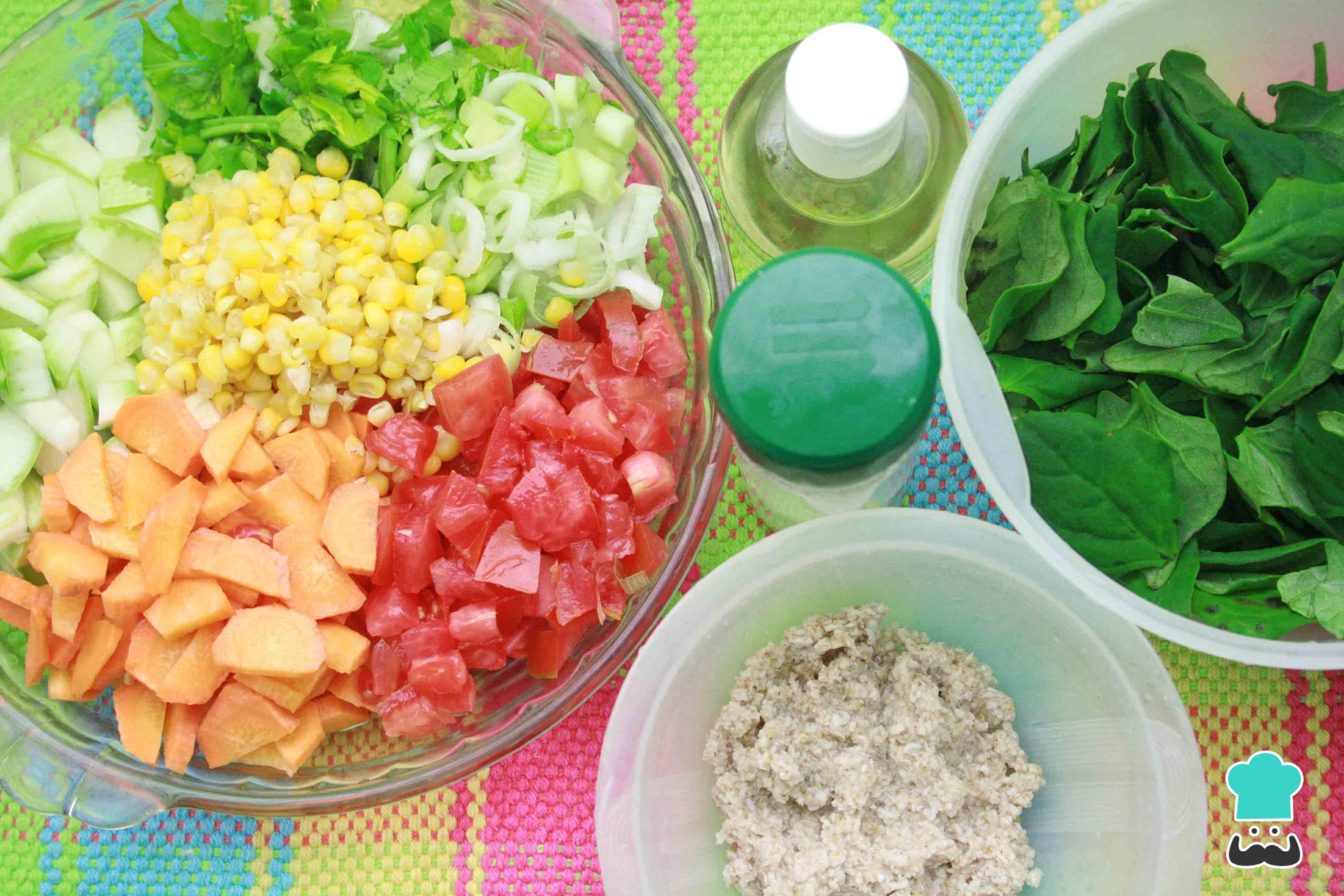 Em seguida lave e pique todos os restantes legumes em cubinhos ou rodelas, com exceção do espinafre: esse você corta com as mãos. Escorra a água do milho e lave com a ajuda de um coador.