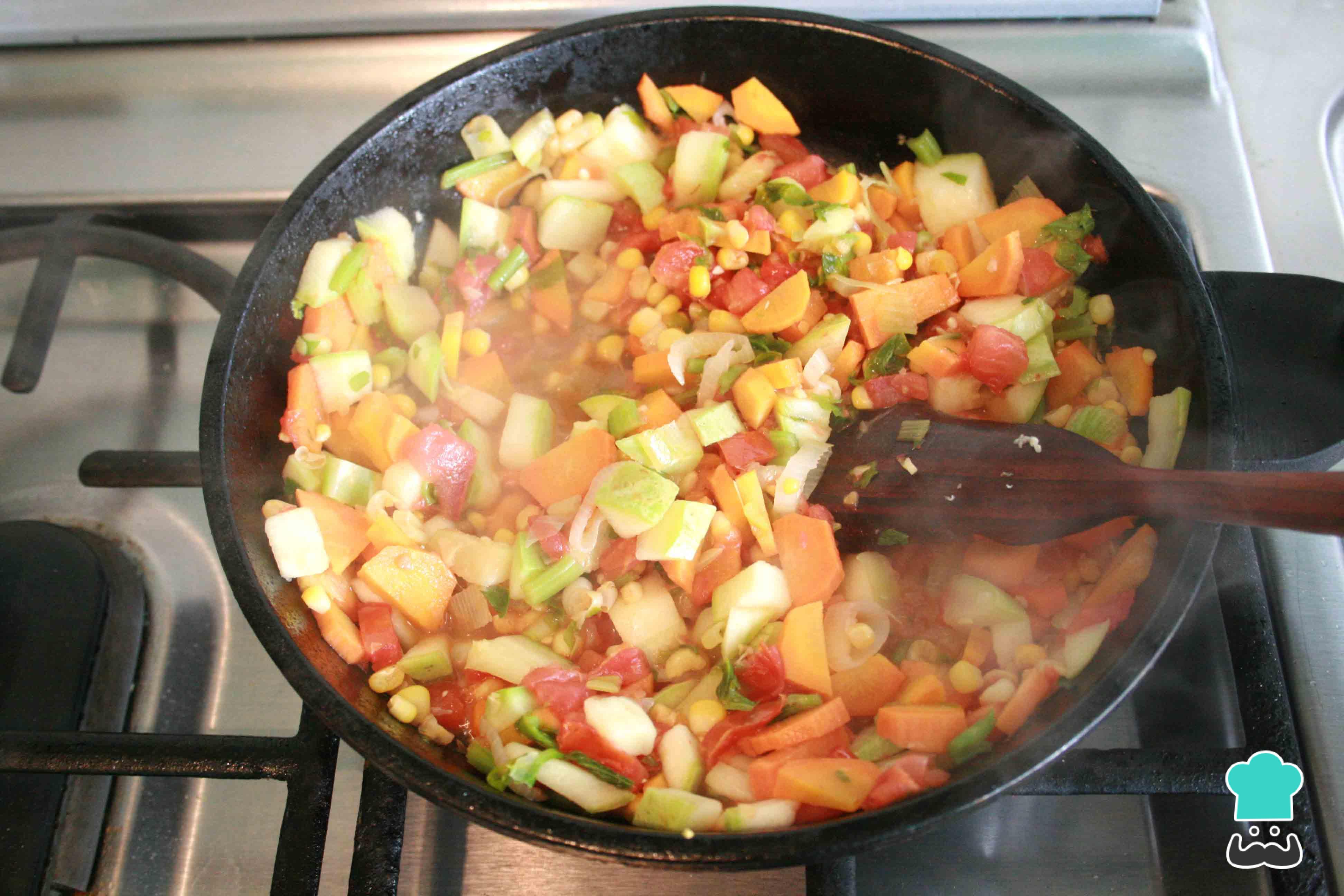 Enquanto isso refogue todos os legumes (com exceção do espinafre) numa frigideira em fogo médio com o azeite. Este passo é importante para que a sopa de aveia para emagrecer fique mais saborosa! Quando a cebola ficar transparente desligue o fogo, os legumes terminarão de cozinhar com a aveia.