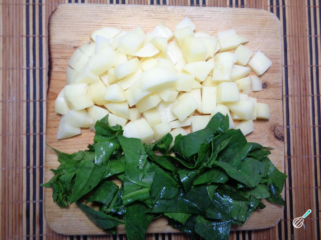 Lave perfeitamente os legumes, descasque e pique a batata em quadrados pequenos. De seguida tenha o mesmo procedimento com o espinafre e reserve.