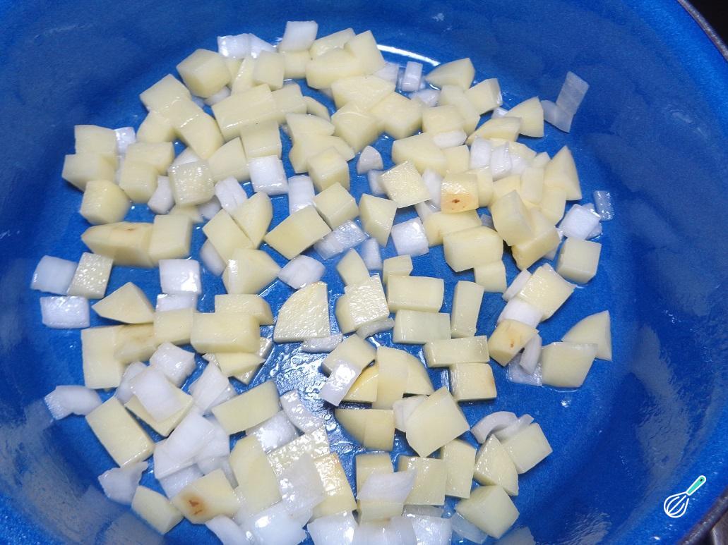 Em uma panela coloque um pouco de azeite e quando estiver quente, adicione os cubos de batata e um pouco de cebola picada. Tempere com sal, pimenta do reino e espere que as batatas dourem.