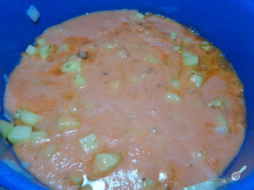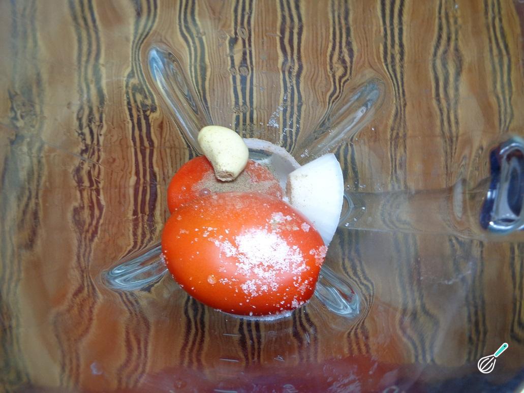 Para continuar com a elaboração da sopa, coloque o tomate, a restante cebola e o alho com um pouco de água, o caldo de frango, sal e pimenta do reino em um liquidificador. Triture e quando as batatas estiverem ligeiramente douradas junte a mistura do liquidificador à panela.
