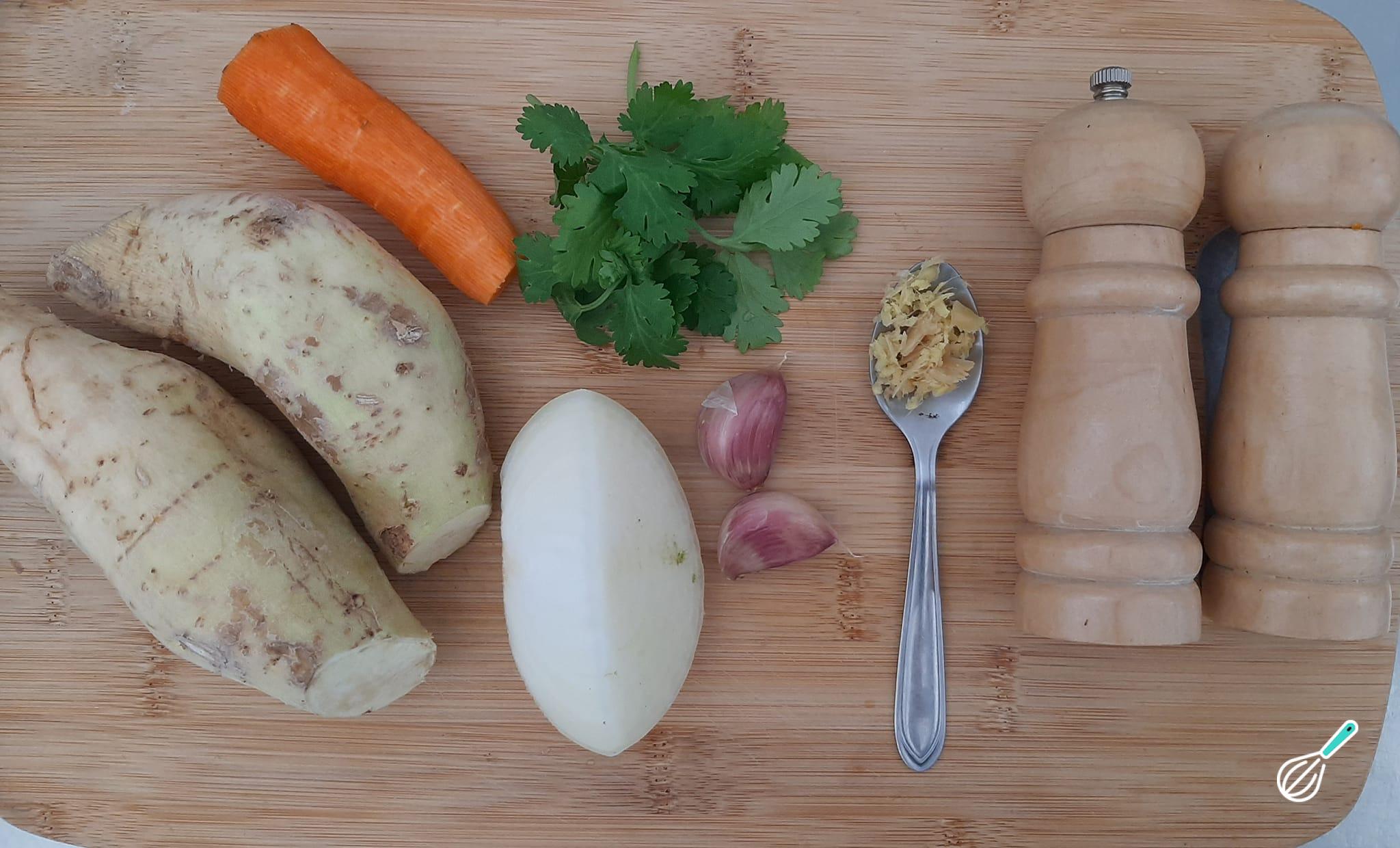 Separe todos os ingredientes necessários para preparar a sopa de batata doce.
