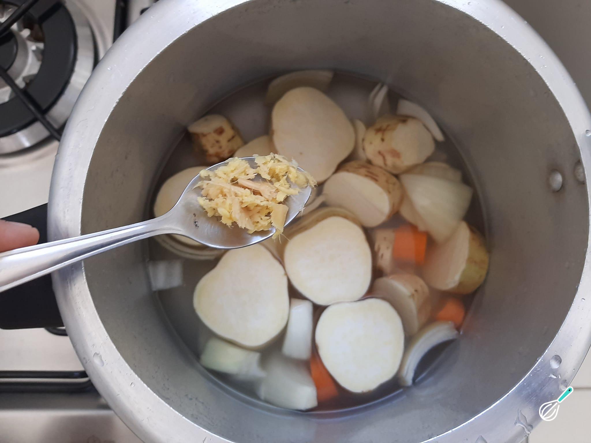 Numa panela de pressão, acomode as batatas doces e a cenoura cortadas em rodelas, a cebola picada, 1 dente de alho picado e o gengibre ralado.