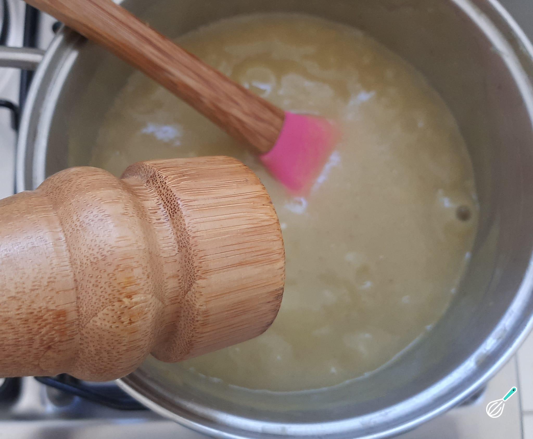 Em seguida, adicione o creme batido no liquidificador e deixe cozinhando por uns 5 minutos, em fogo baixo, mexendo de vez em quando.