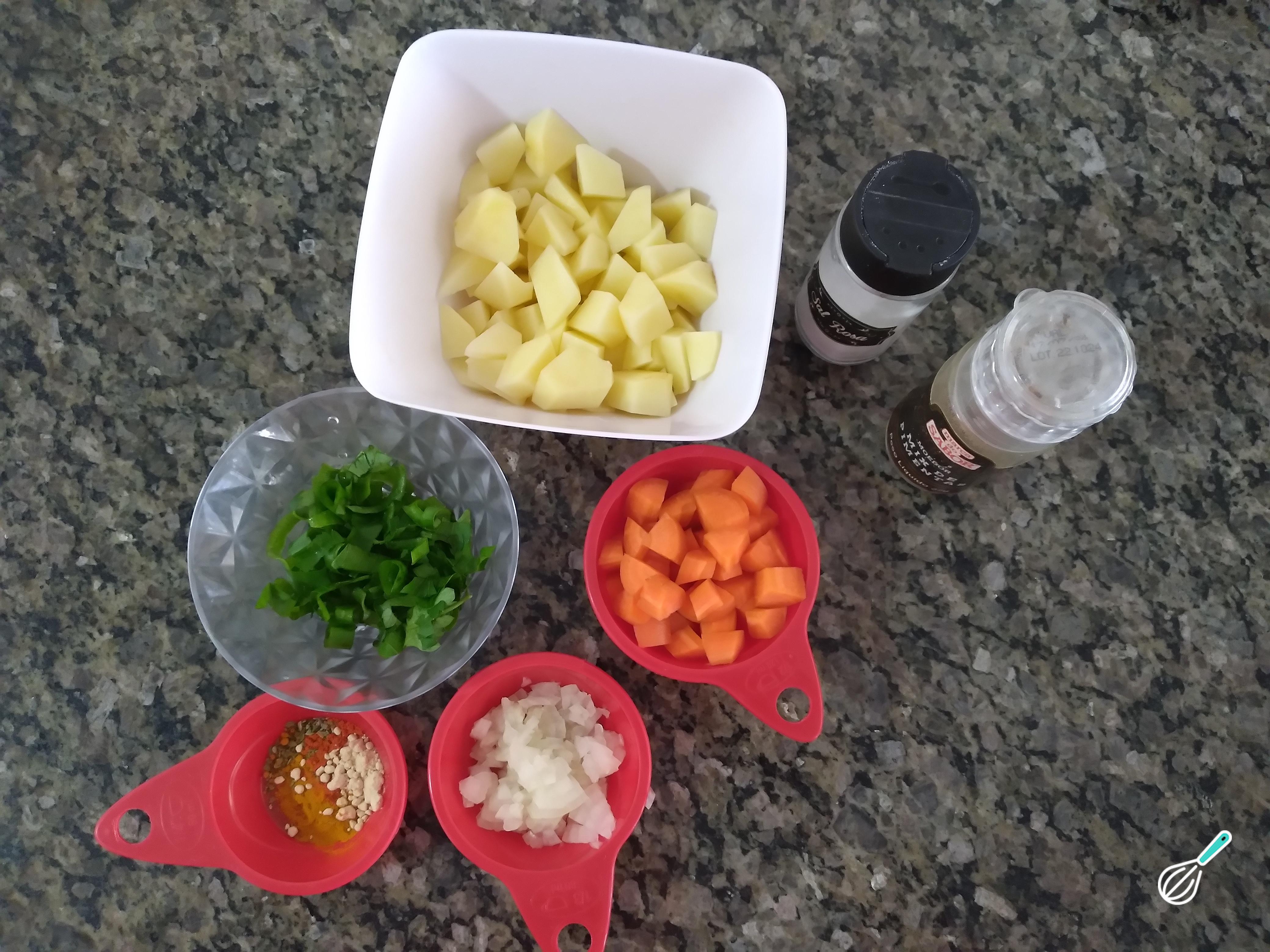 Comece separando todos os ingredientes para fazer a sua Sopa de batata e cenoura.