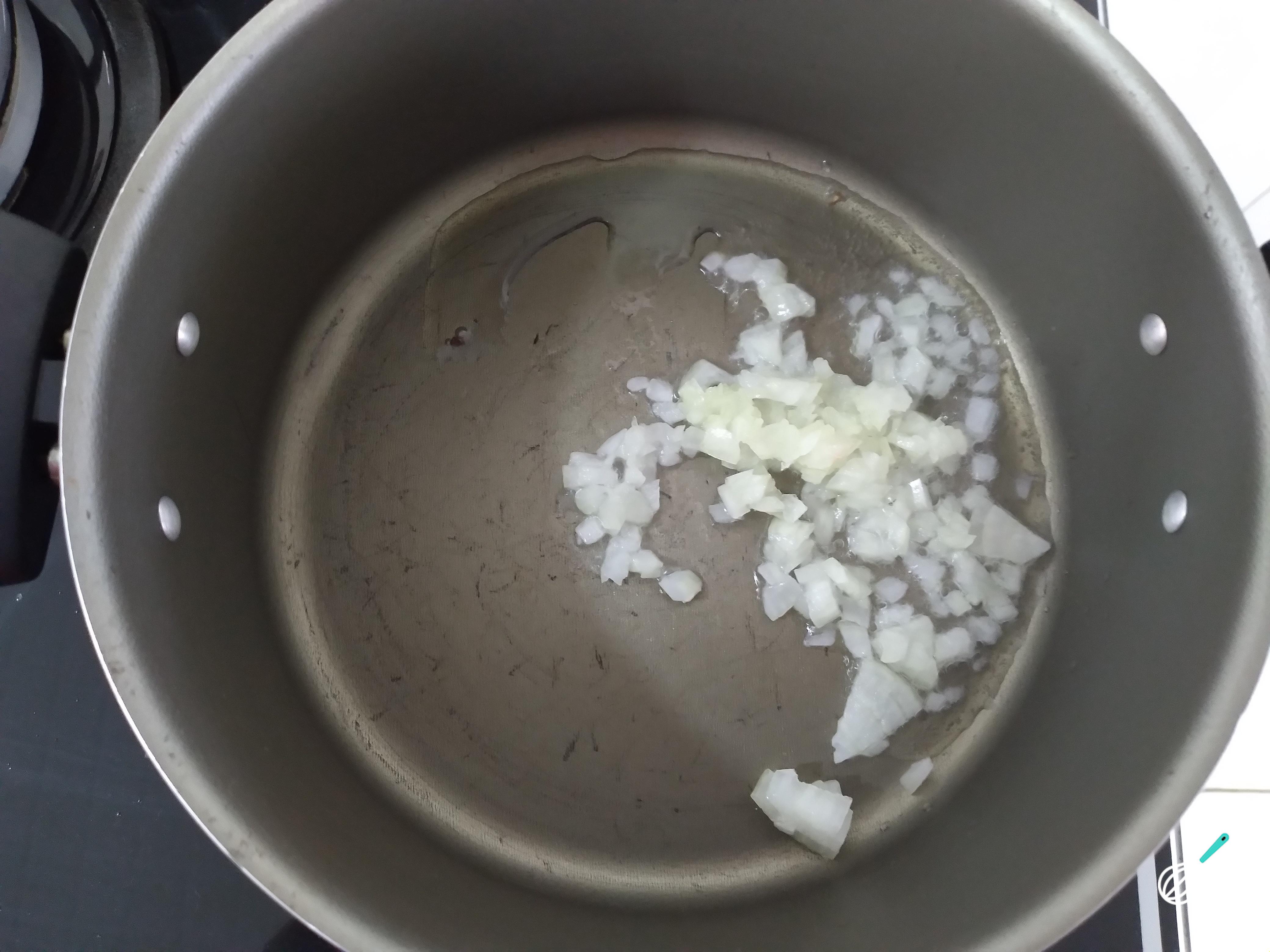 Numa panela, comece colocando o óleo ou azeite e refogando a cebola.