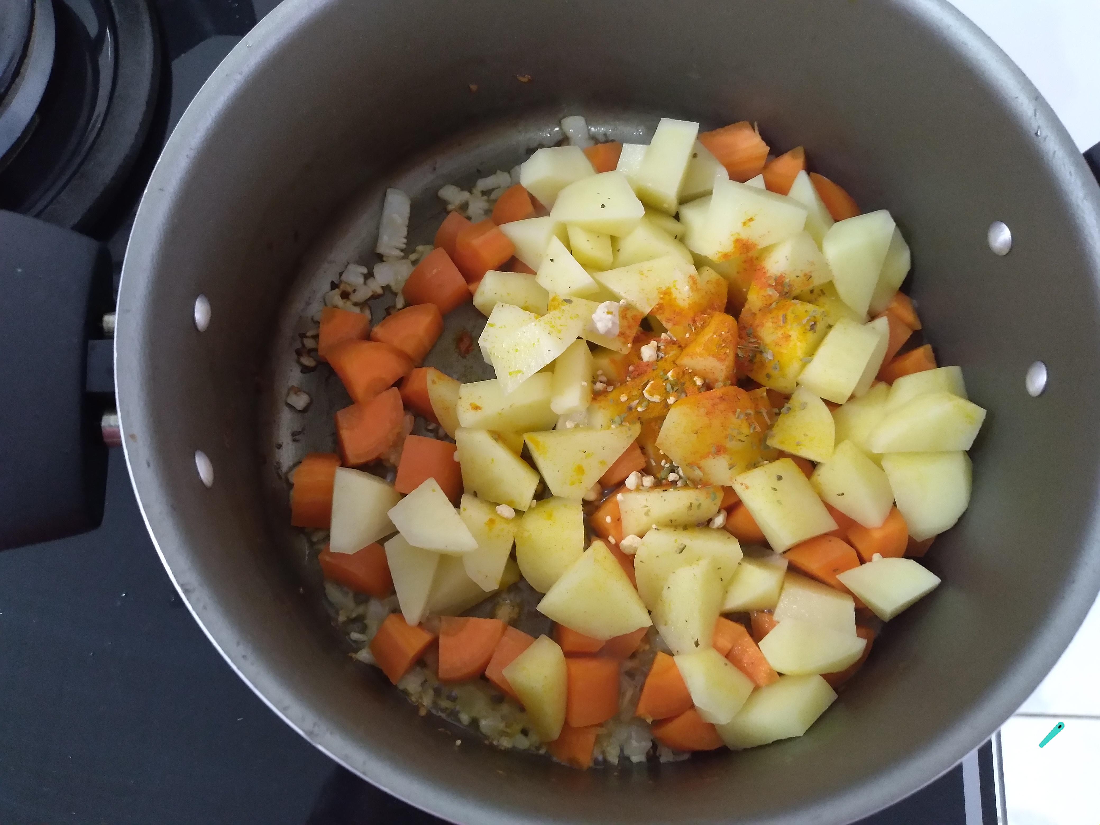 Depois de refogar a cebola, coloque os legumes e mexa para pegar um pouco de sabor.