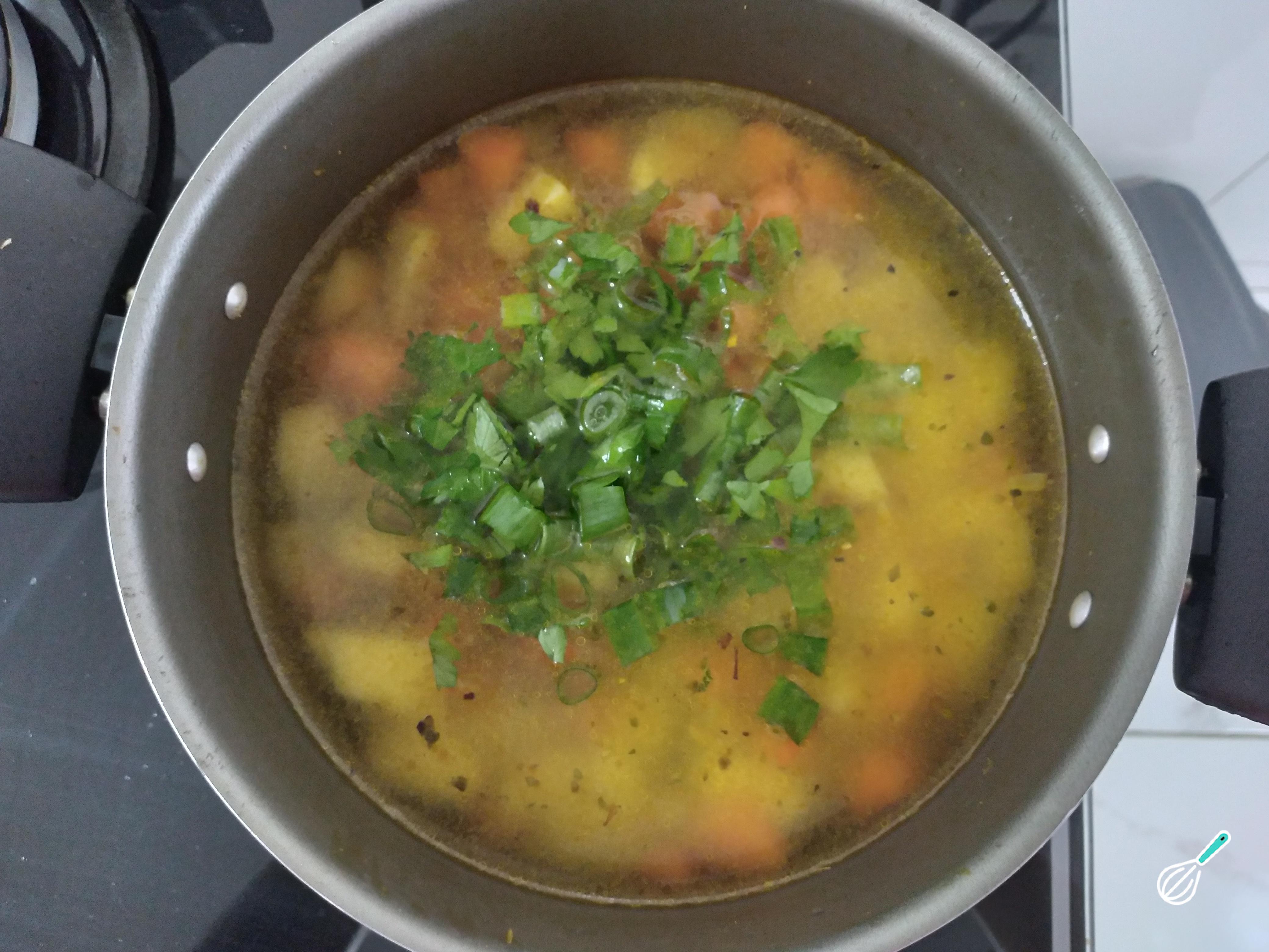 Em seguida, cubra os legumes com água, e acrescente a salsa e cebolinha picadas.