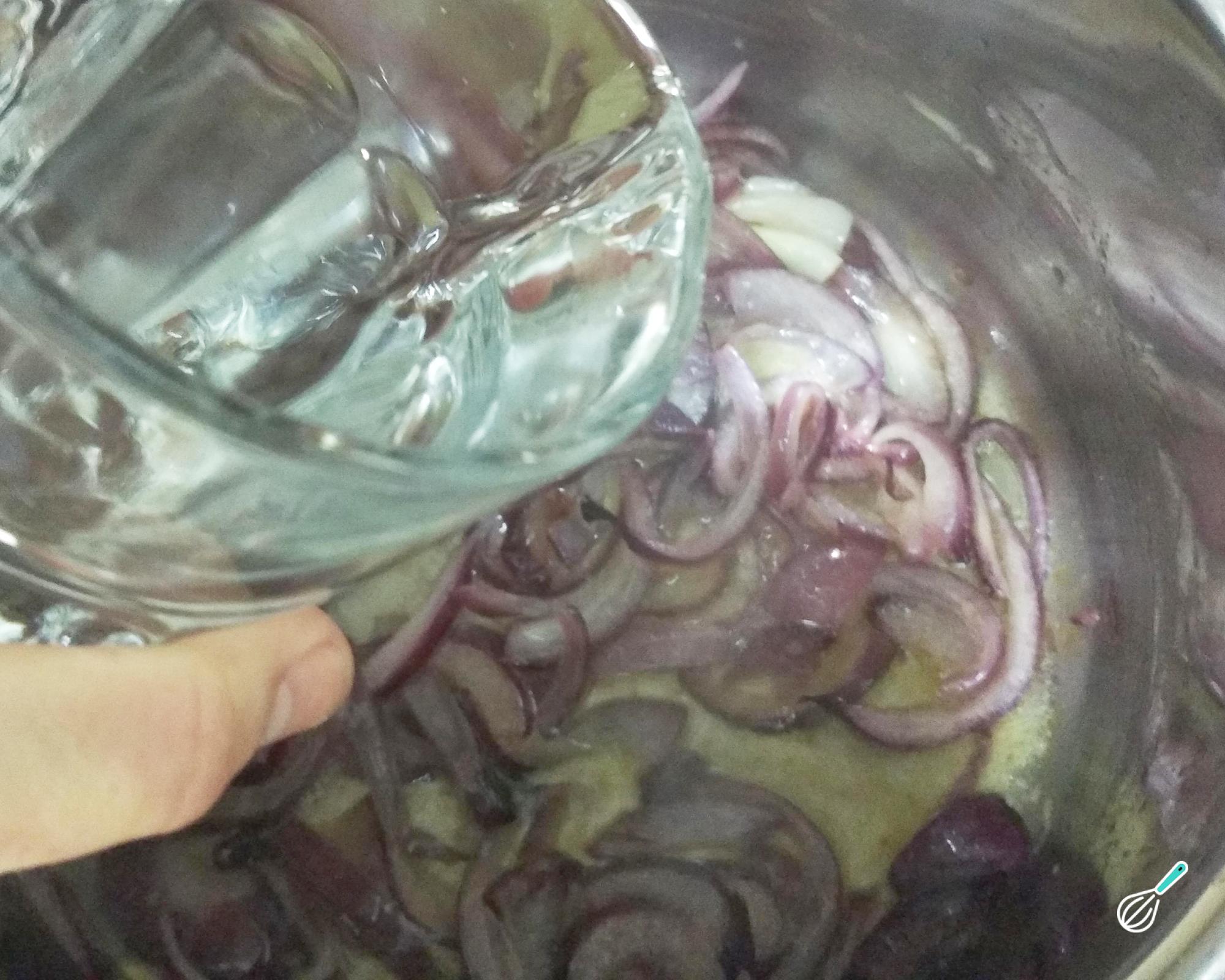 Em seguida adicione a água e tampe a panela. Deixe cozinhar por cerca de 20 minutos no fogo baixo, para a cebola ficar bem macia e desfazendo.
