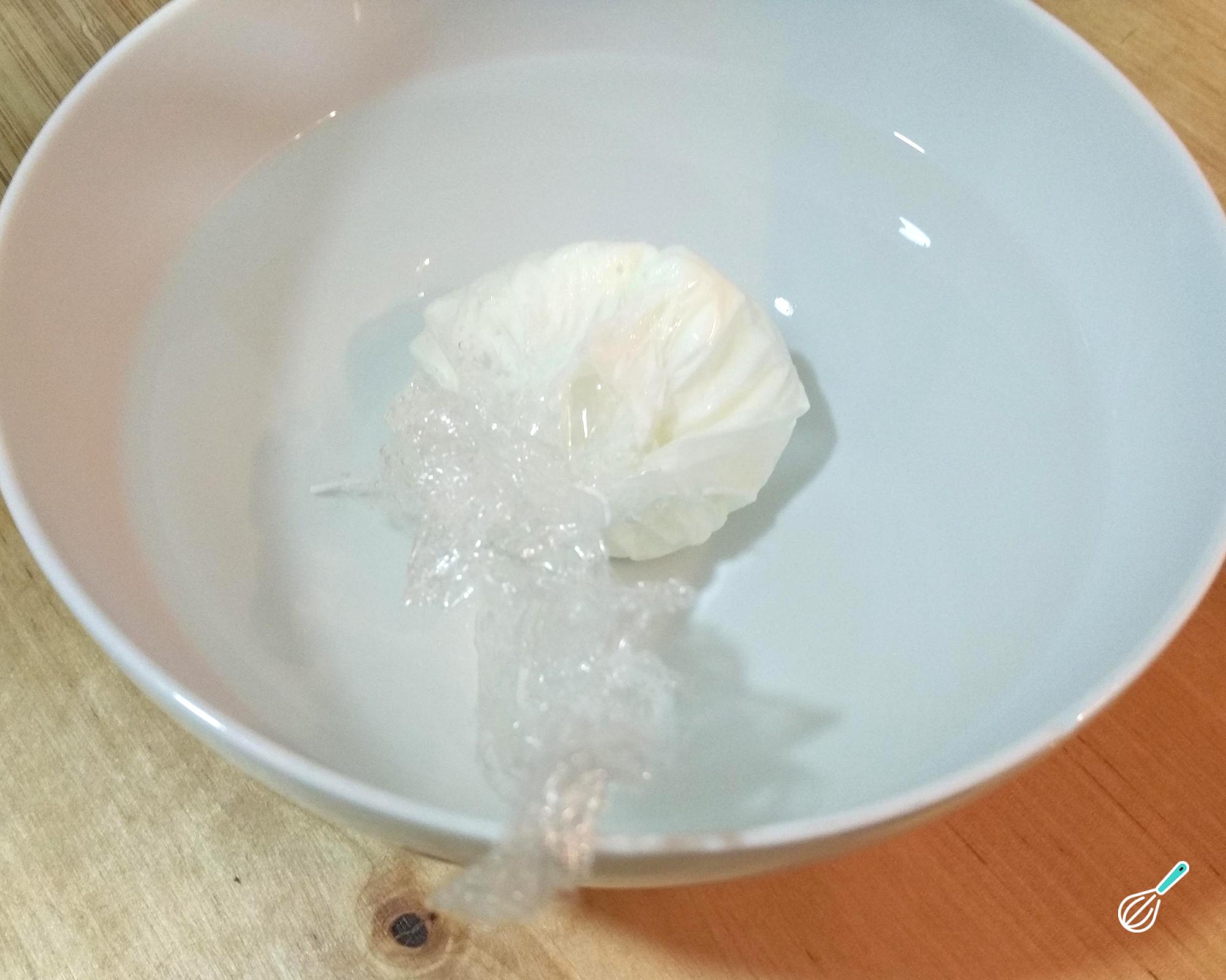 Enquanto isso, prepare o ovo pochê para acompanhar: abra um pedaço de plástico filme numa tigela ou copo e coloque no centro um ovo partido (gema e clara). Tempere com um pouco de sal e amarre em forma de trouxinha. Faça isso com os todos os ovos, cada um na sua "trouxinha", e coloque numa panela com água fervente.