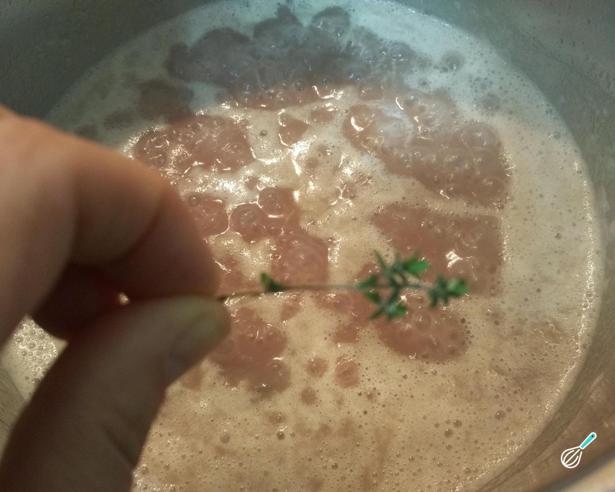 Após a sopa de cebola light ferver por 20 minutos, adicione os raminhos de tomilho e deixe ferver por mais 5 minutos, somente para aromatizar.