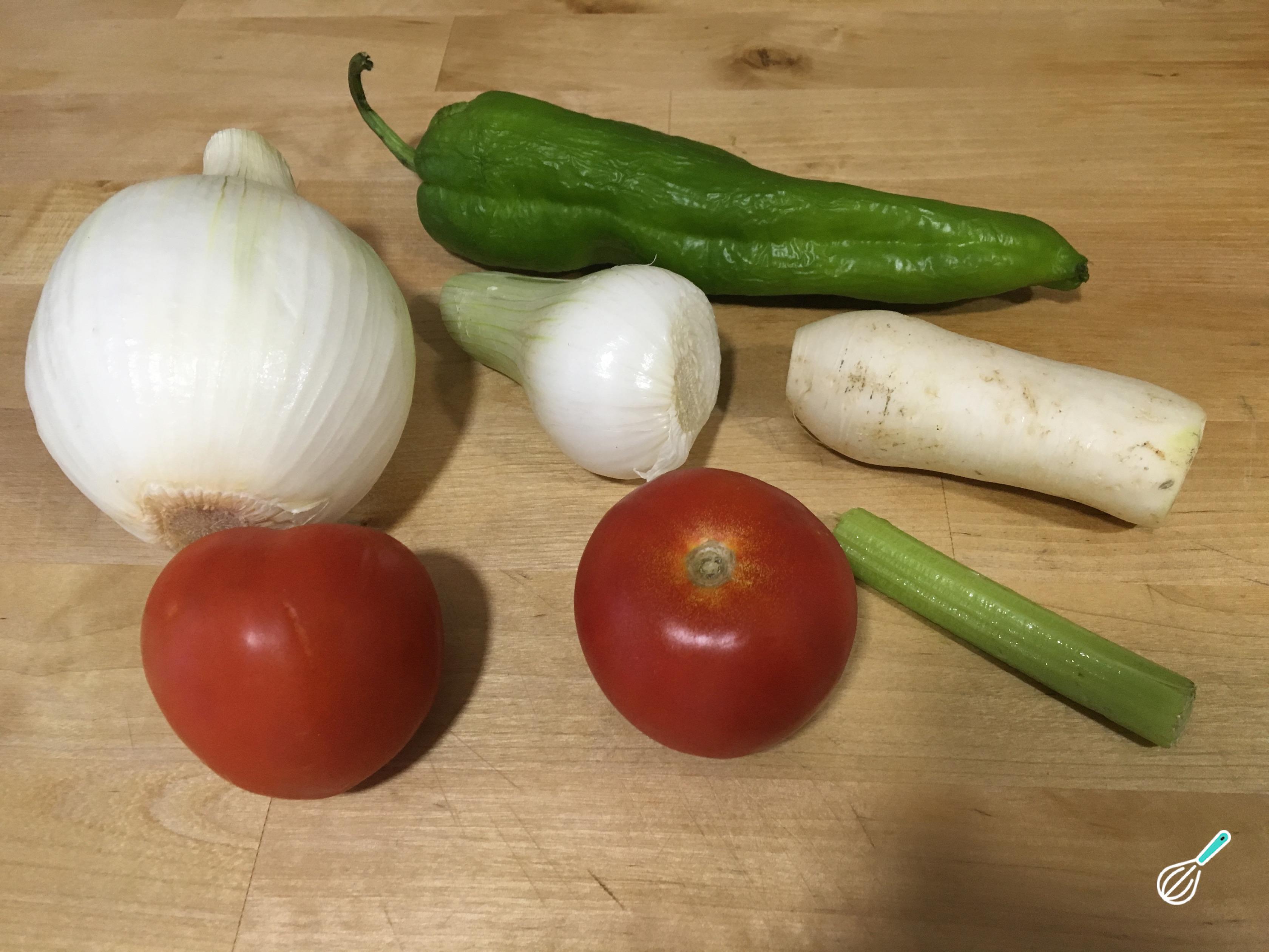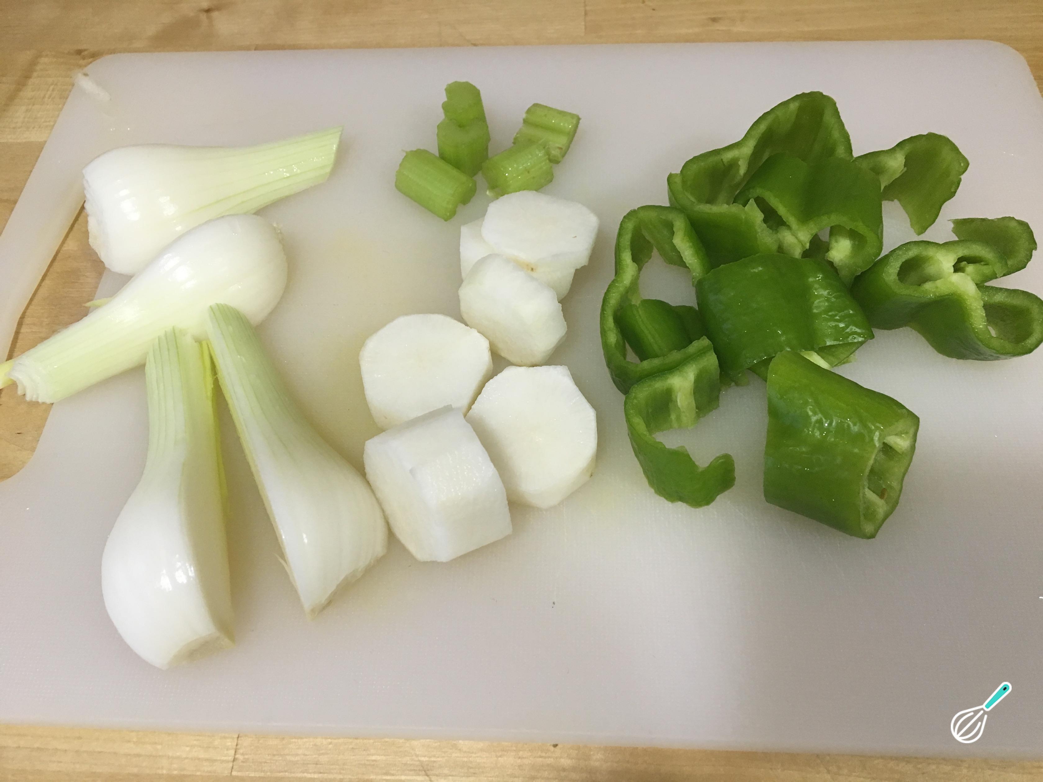 Em primeiro lugar, corte as cebolas em quartos. Descasque e corte o nabo em fatias grossas. Lave o pimentão, retire as suas sementes e corte em pedaços grandes. Corte também o aipo em pedaços.