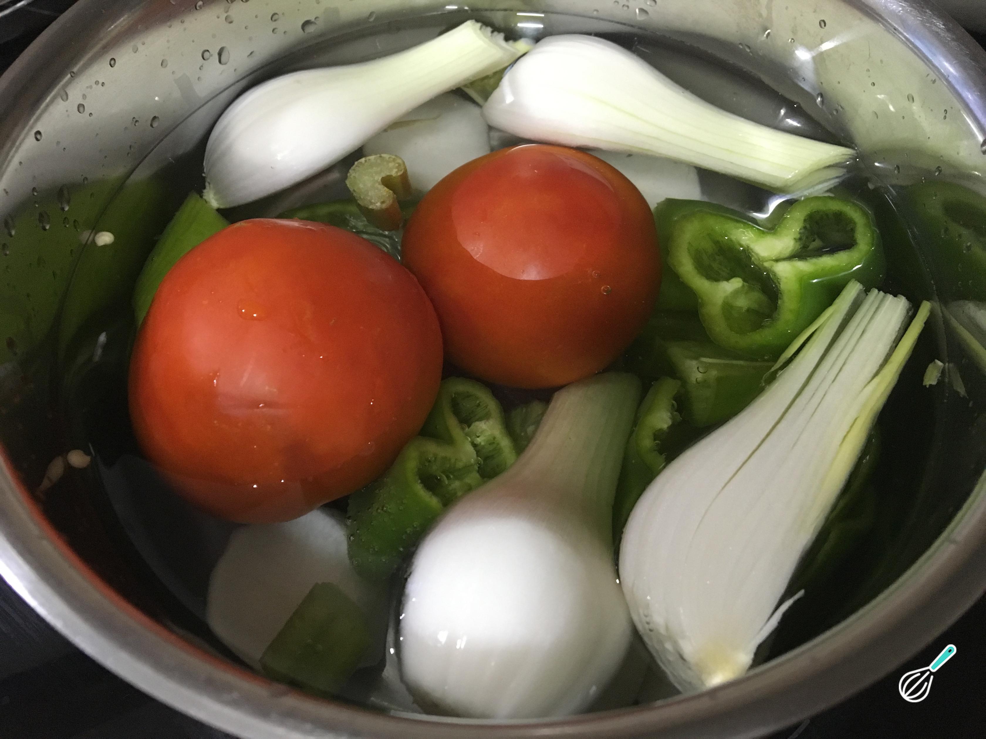 Coloque os legumes em uma panela e adicione água junto com o tomate lavado e inteiro. Adicione um pouco de sal e deixe a sopa de cebola ferver por 40-50 minutos.