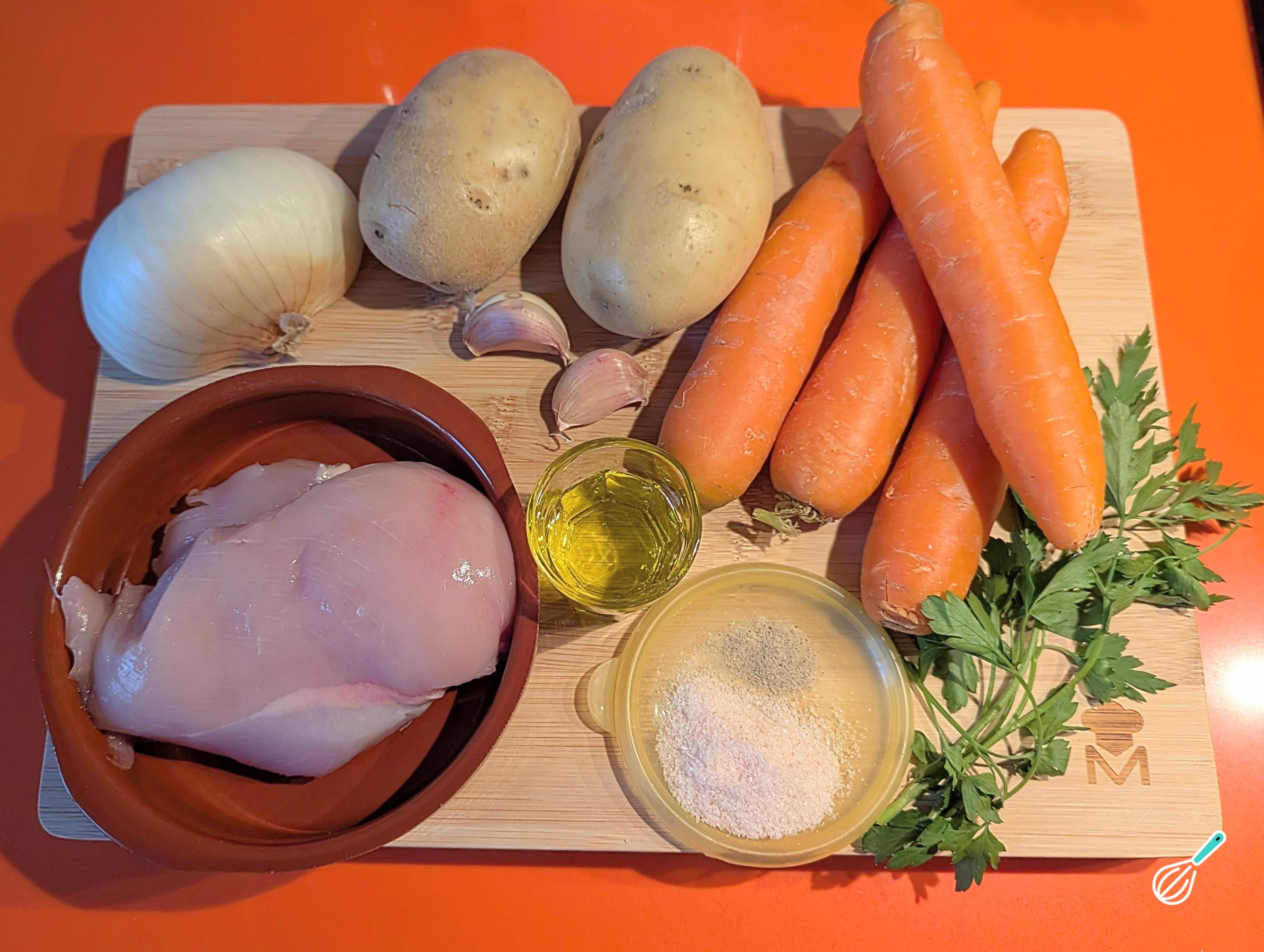 Separe os ingredientes descritos acima antes de começar o preparo. Descasque e corte em pedaços pequenos as batatas e as cenouras. Pique o alho e a cebola. Corte o peito de frango em cubos. Deixe tudo separado para logo utilizar no preparo da sopa.