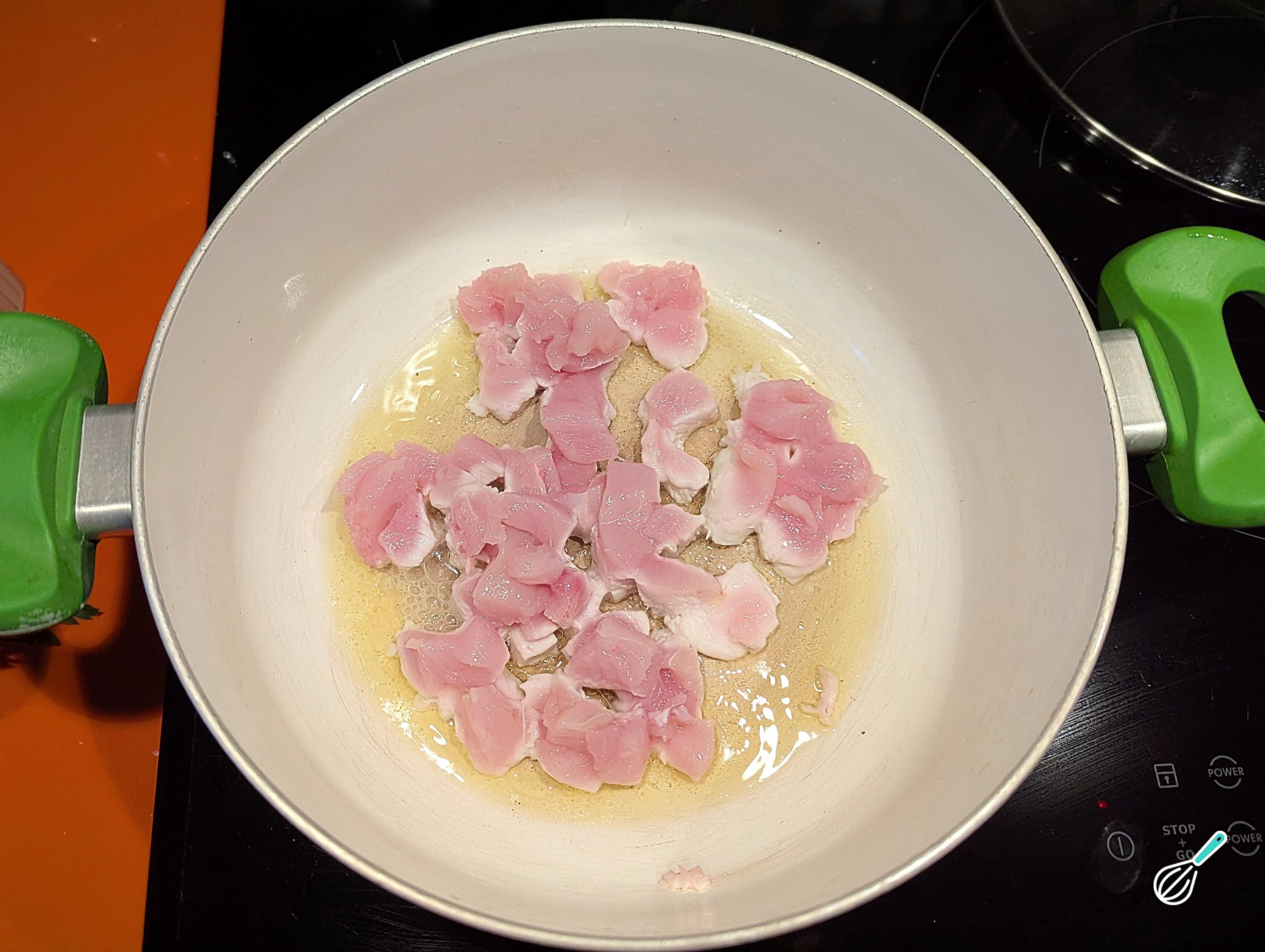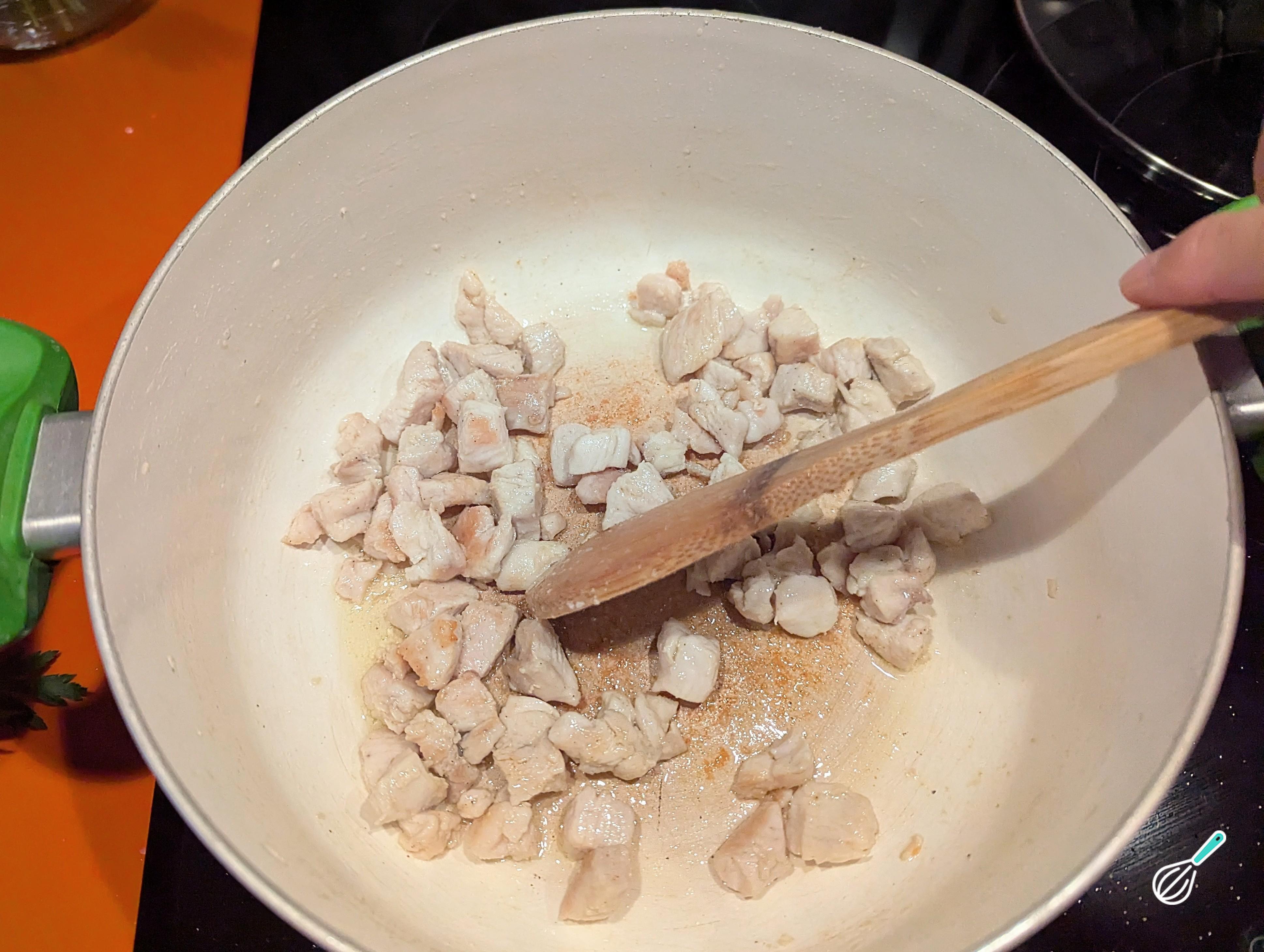 Em uma panela grande, aqueça um pouco de azeite ou óleo e acrescente o peito de frango cortado em cubos e deixe dourar levemente. Adicione uma pitada de sal e pimenta branca ou do reino a gosto.