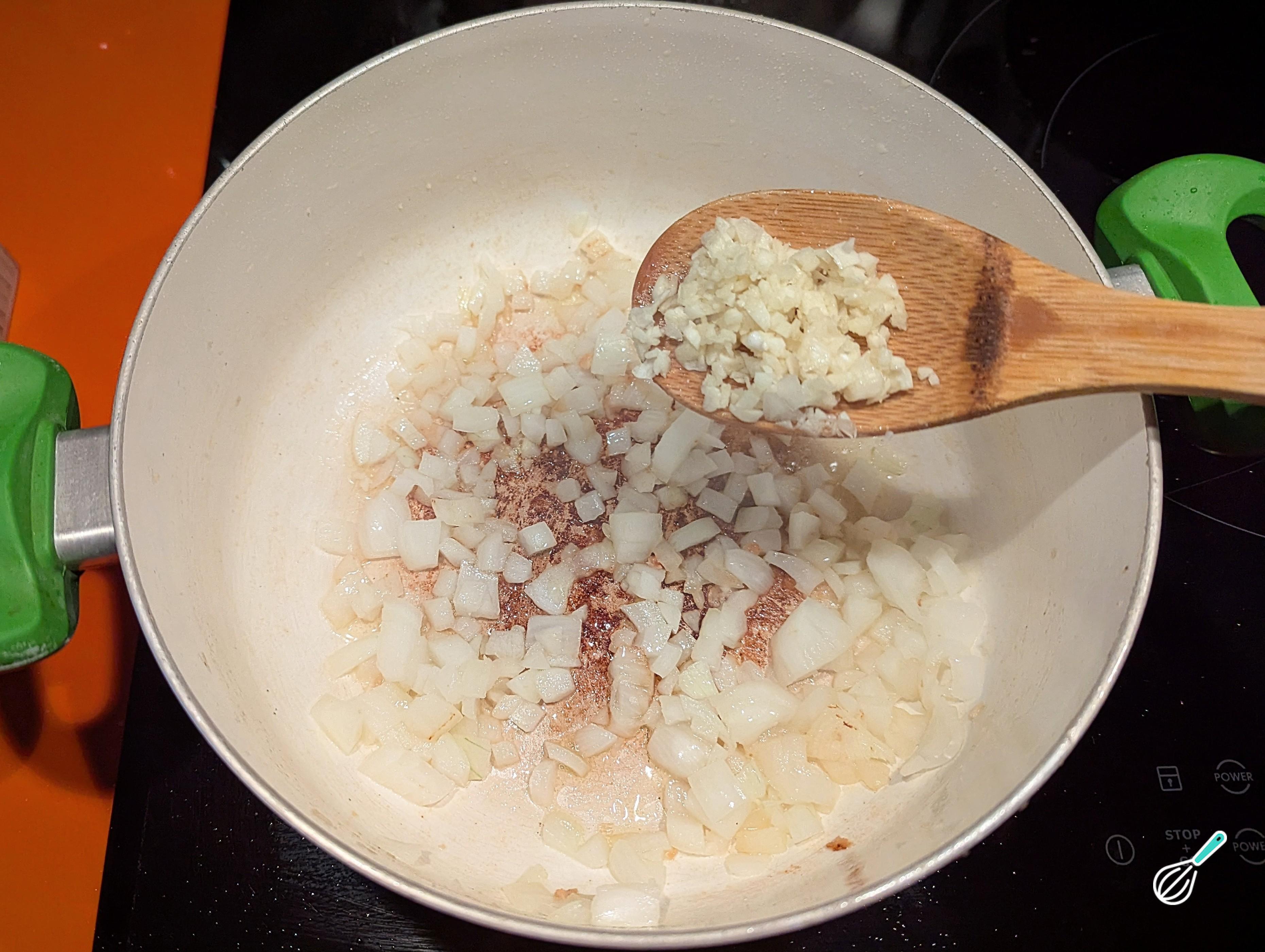 Na mesma panela (com o fundo dourado do frango), acrescente um fio de azeite e coloque a cebola para refogar. Quando murcharem um pouco, adicione o alho picado e refogue por mais um minuto ou até ficar dourado.