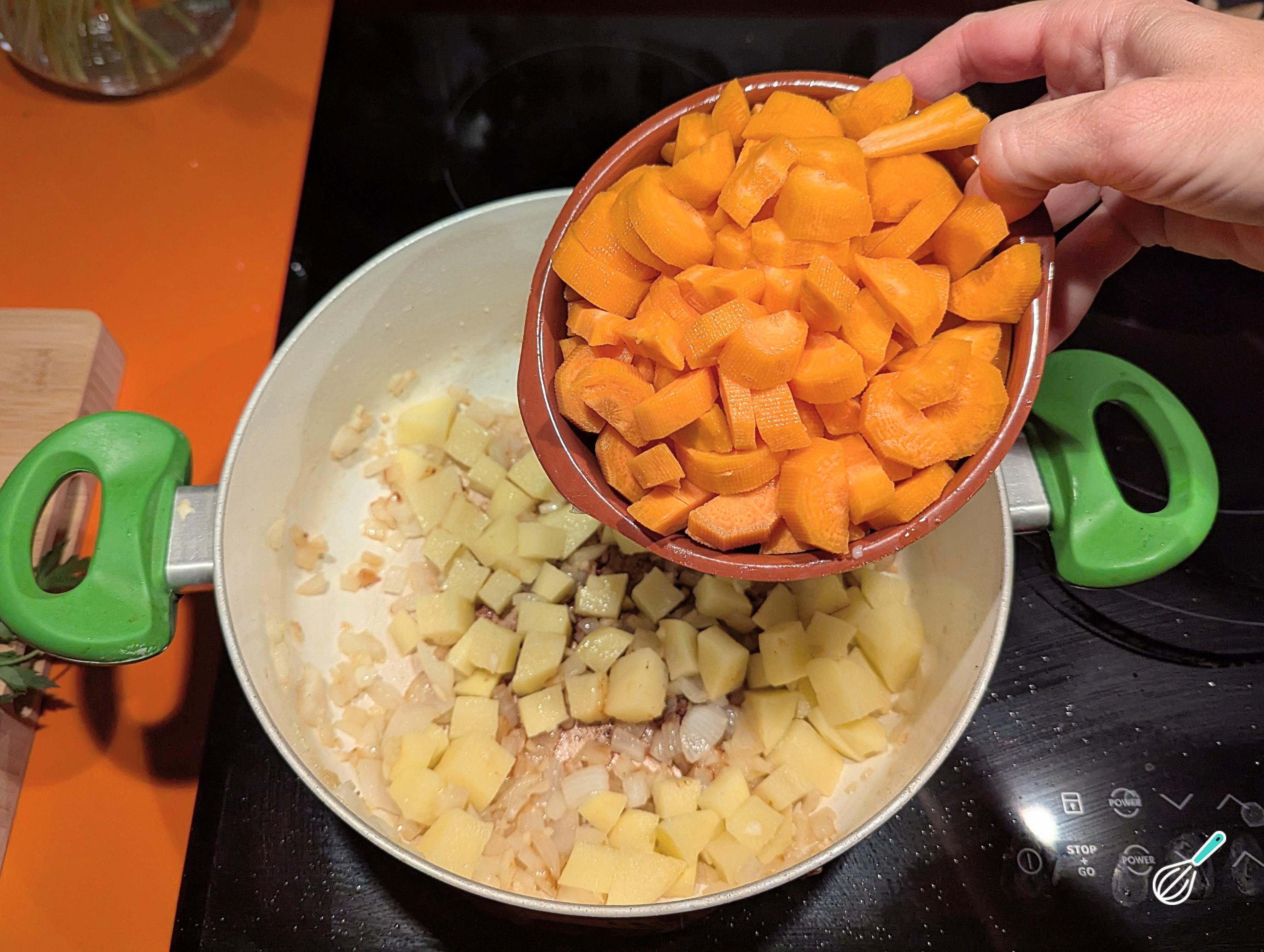 Junte as batatas cortadas e mexa bem para que se envolvam ao sabor do refogado. Depois, acrescente a cenoura picada e misture tudo.