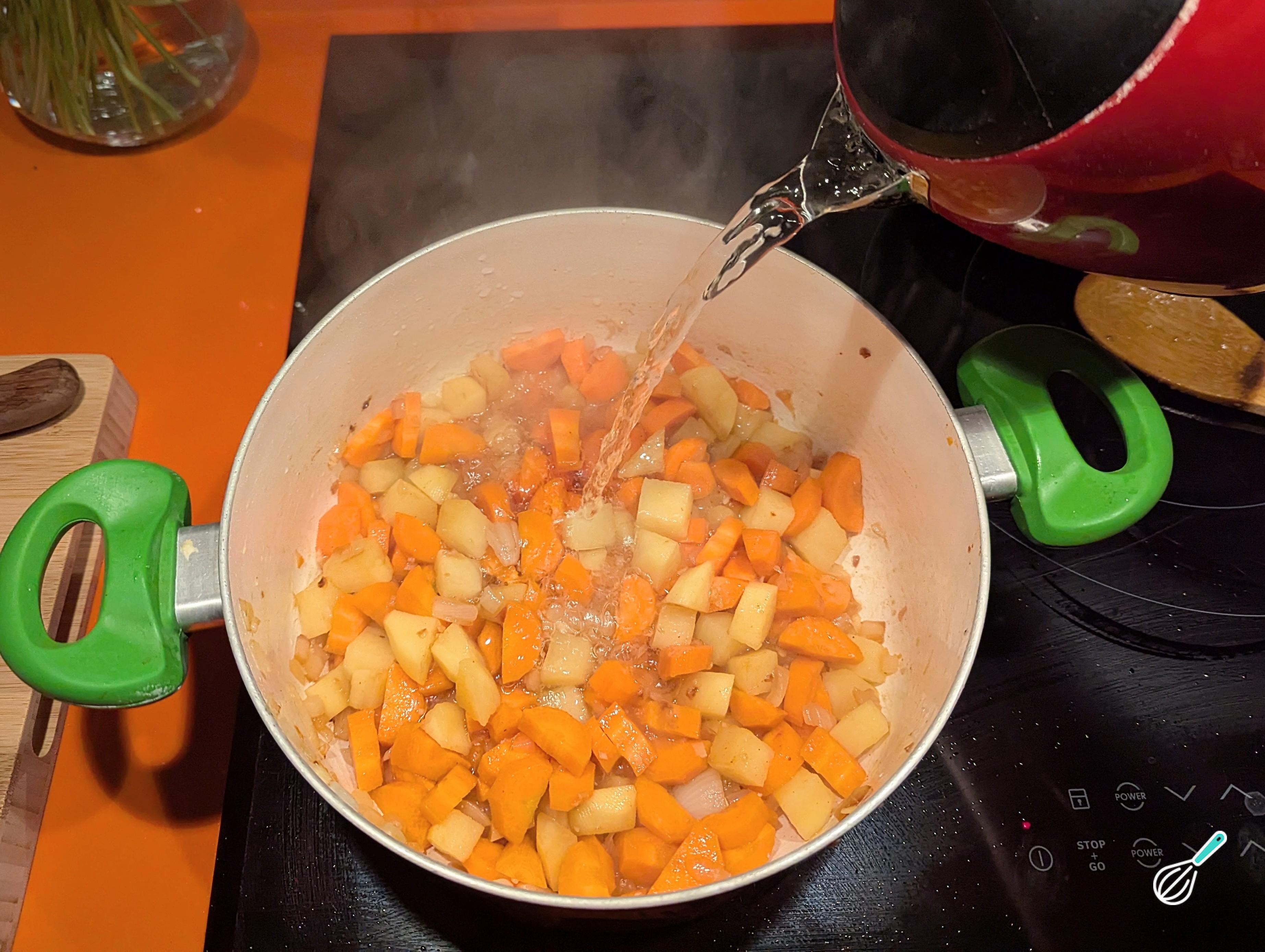 Acrescente cerca de 1 litro de água quente, tampe e deixe refogar por uns 20 minutos ou até os legumes estarem bem macios.