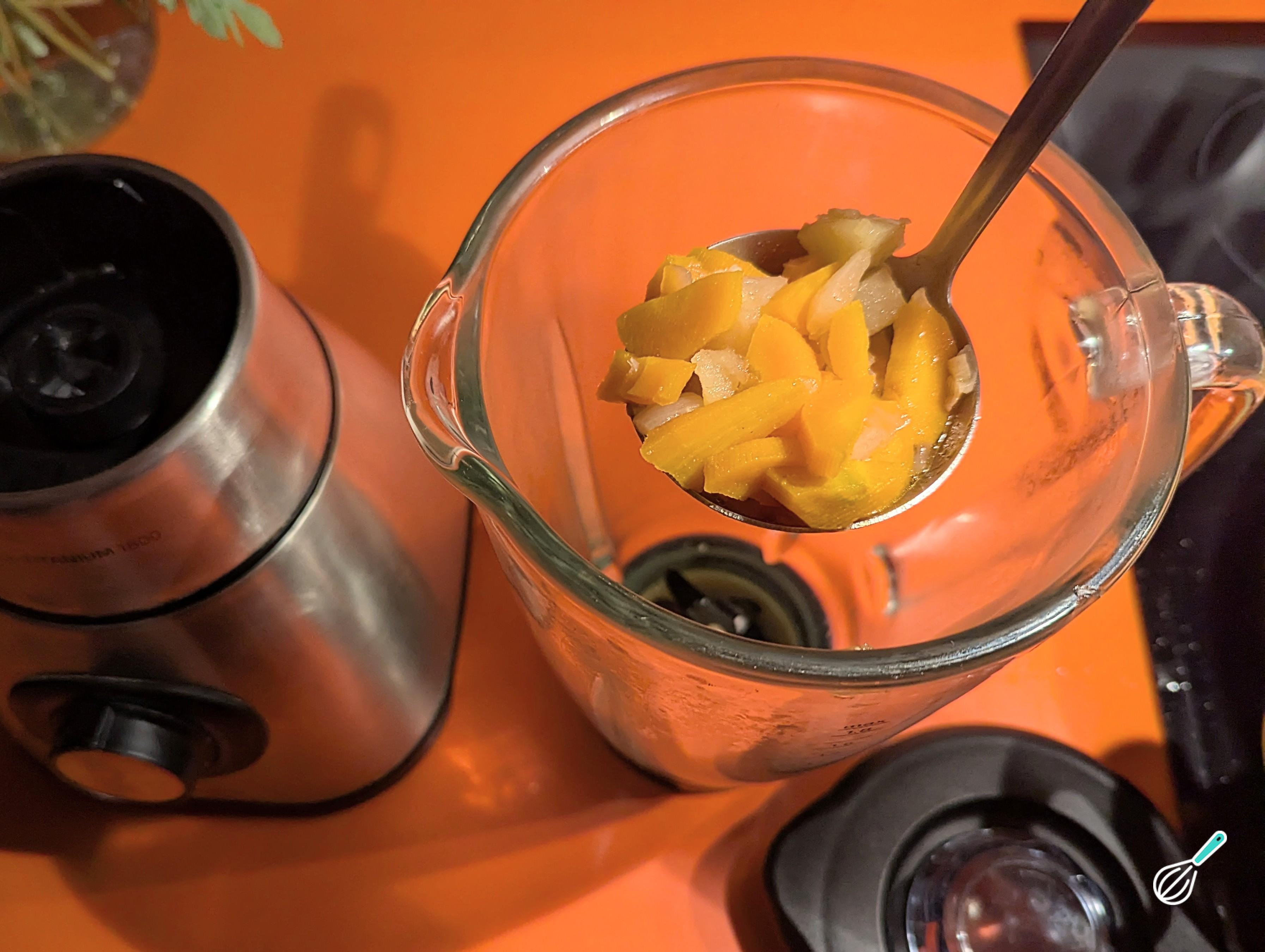 Desligue o fogo e transfira a sopa para um liquidificador com ajuda de uma concha. Bata até obter um creme liso e homogêneo.