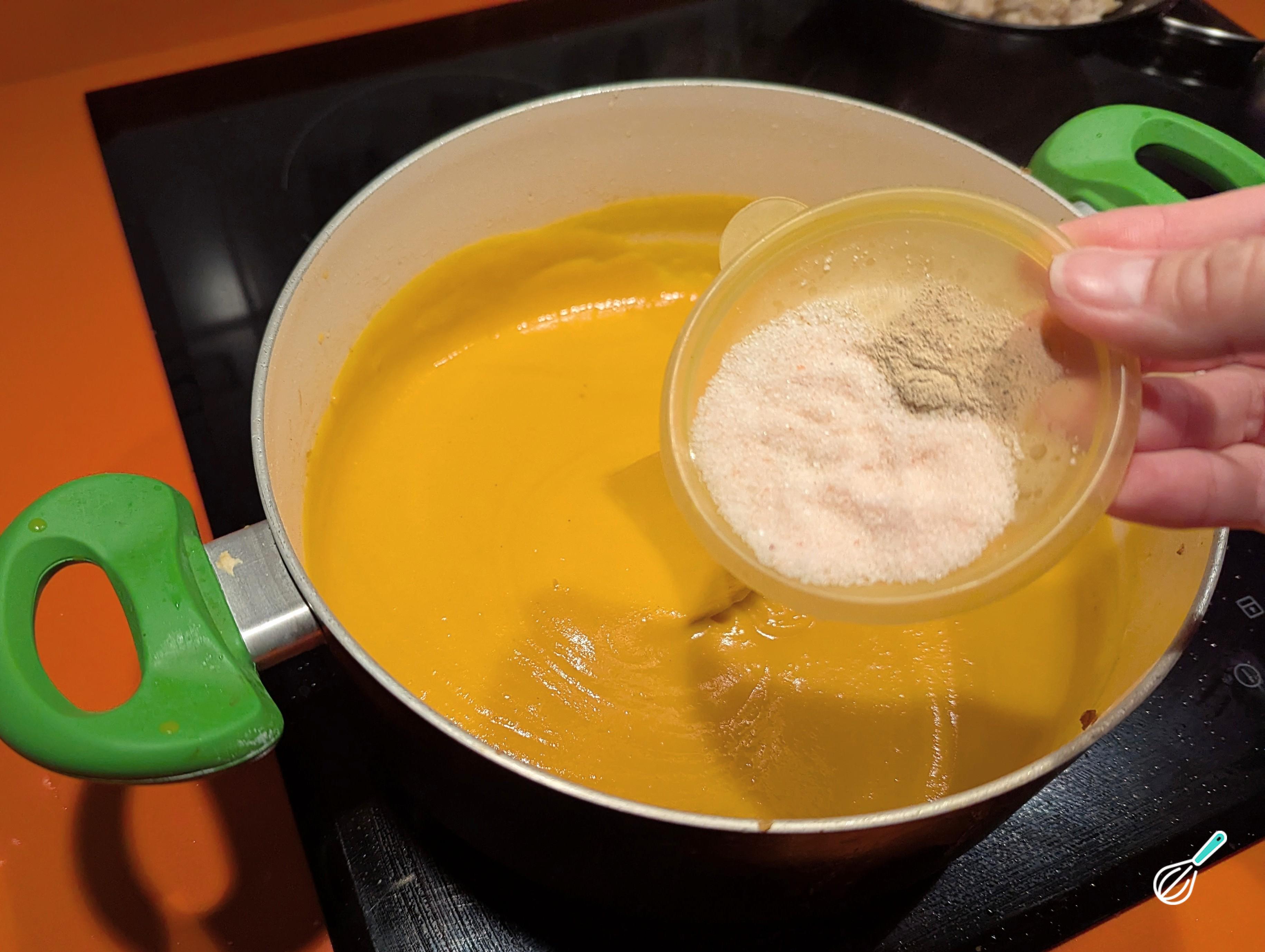 Volte o creme para a panela e ajuste o sal e a pimenta branca a gosto. Cozinhe por mais uns 2 minutinhos e já está pronto.