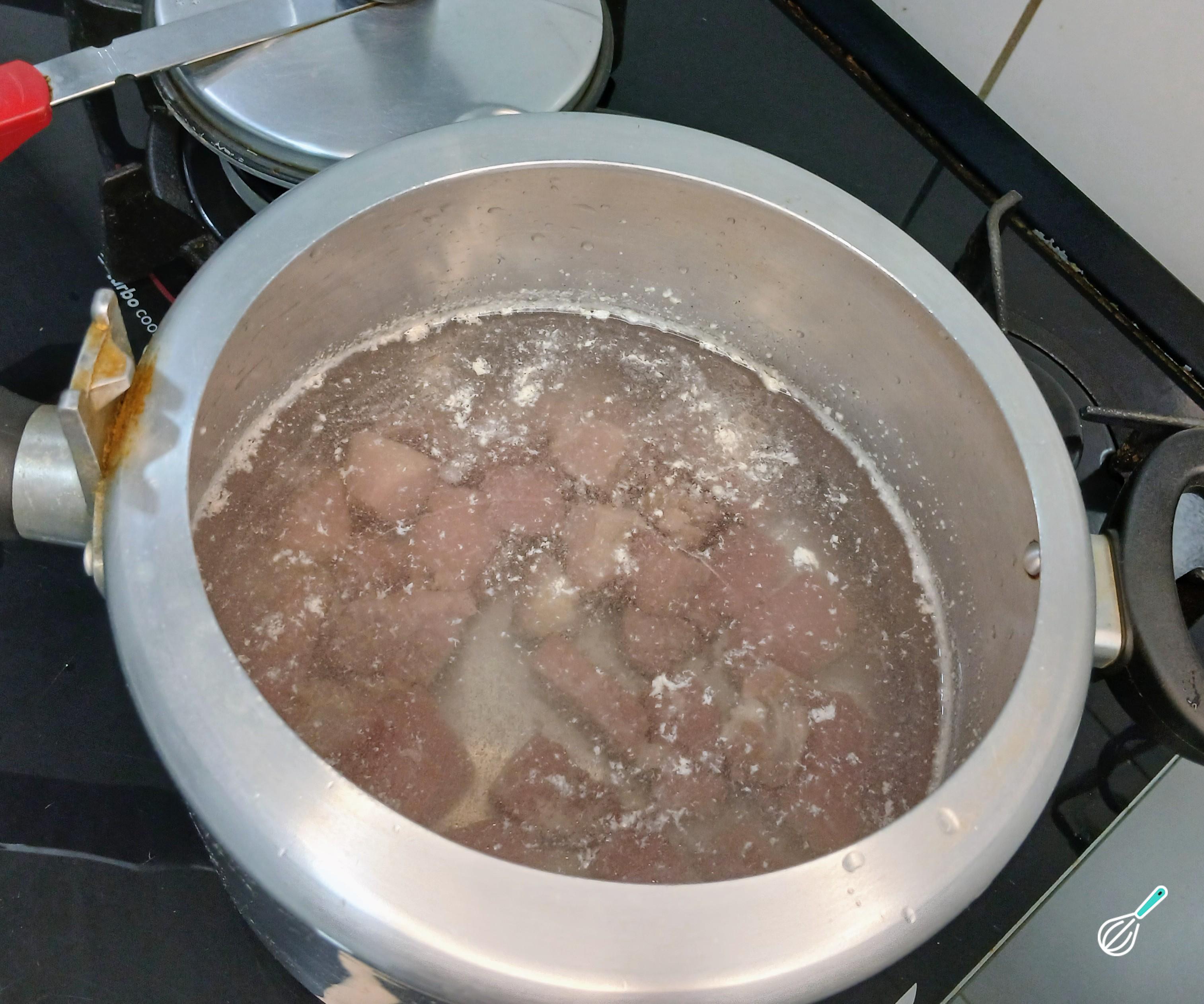 Feito isso, leve a carne para a panela de pressão e cubra com água. Tampe a panela e assim que pegar pressão marque 30 minutos. Terminado o tempo, desligue o fogo e deixe a pressão sair naturalmente.