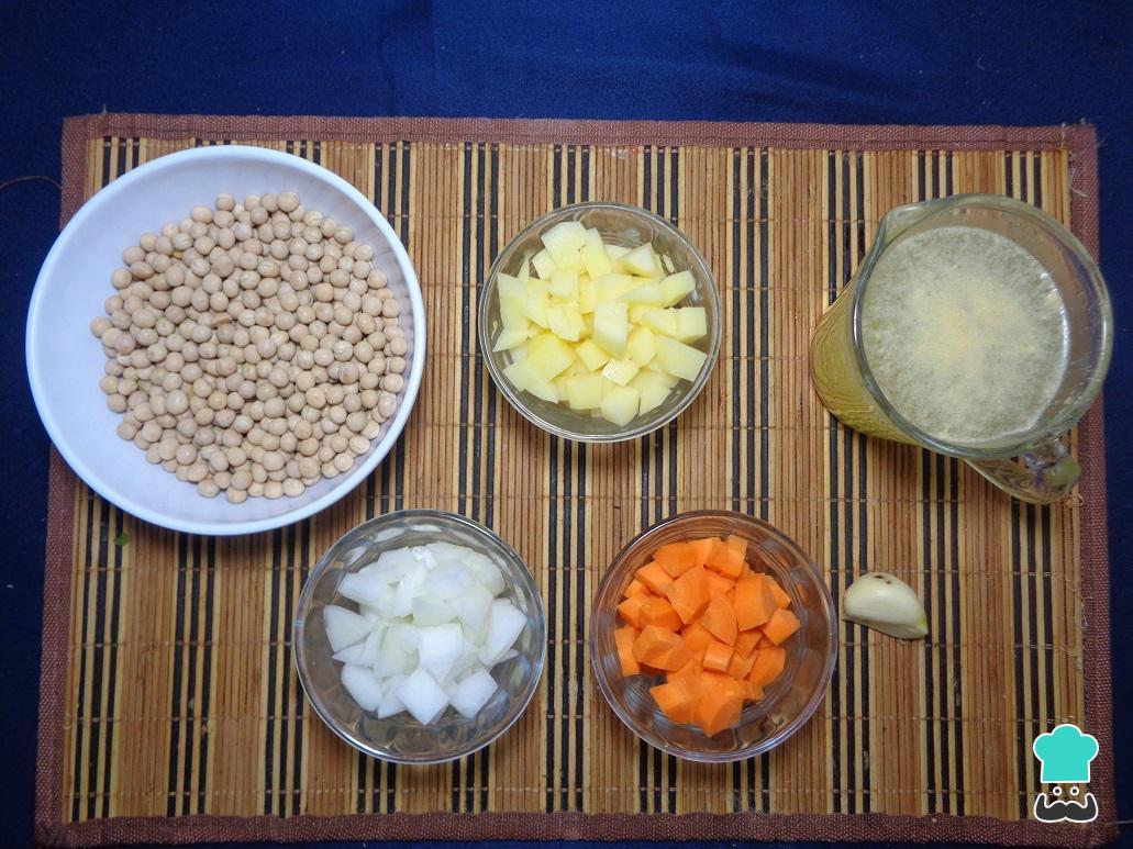 O primeiro passo para preparar esta receita de sopa de chícharos secos, é juntar todos os ingredientes necessários. Poderá verificar na imagem abaixo os ingredientes.