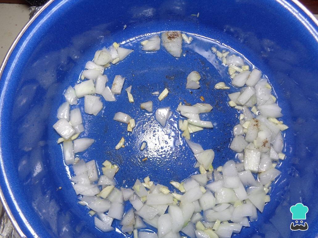 Coloque um uma panela o azeite, a cebola picada, o alho previamente picados, tempere com sal, pimenta do reino e leve ao fogo, esperando que a cebola fique dourada e obtenha uma textura suave.
