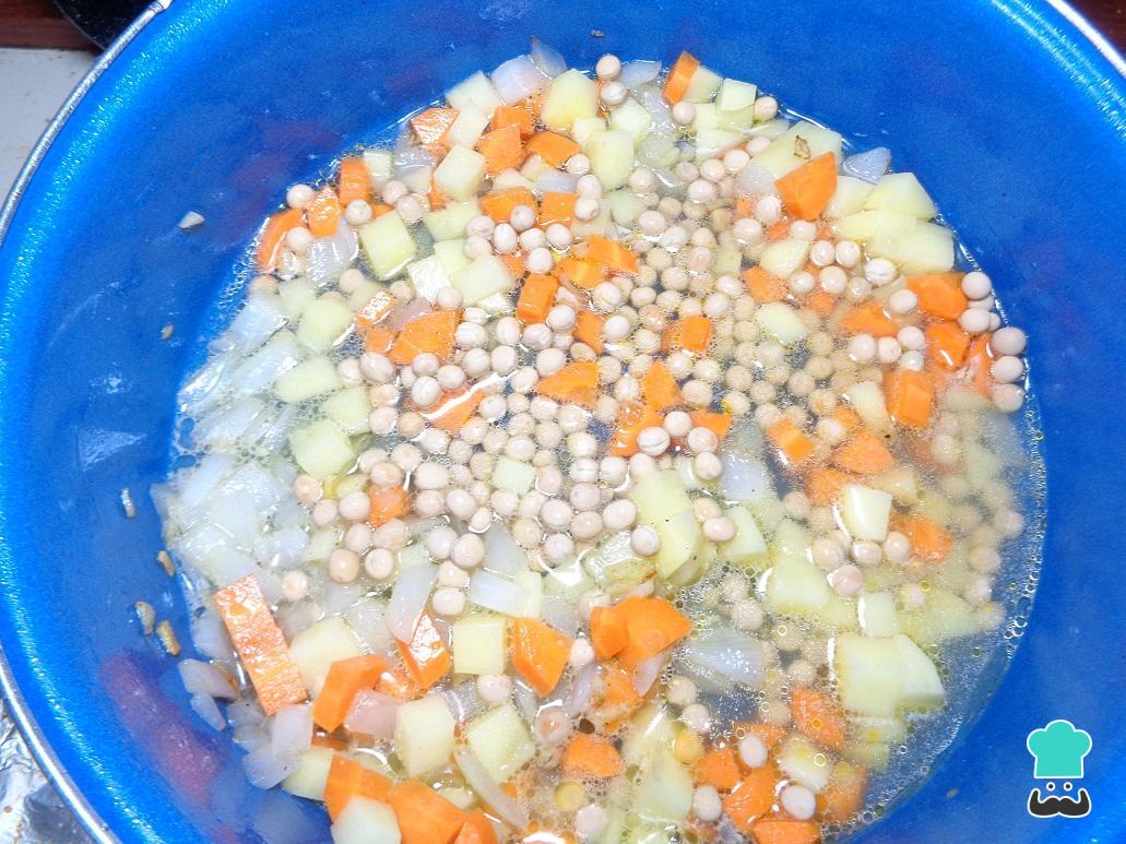 Descasque as cenouras, as batatas, de seguida corte em pedaços grandes e junte na panela. Junte também na panela metade dos chícharos e o caldo de frango. Espere que levante fervura, mexendo de vez em quando para que não pegue.