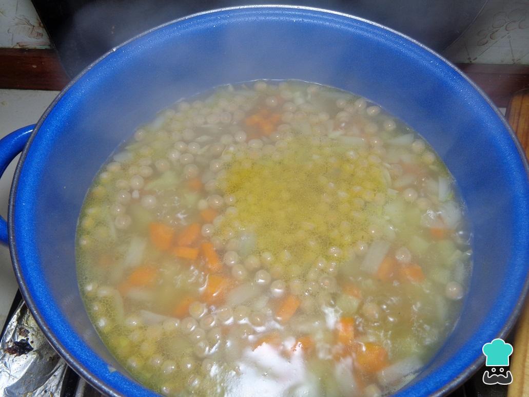 Uma vez que a sopa levante fervura, junte os restantes chícharos e deixe cozinhar em fogo baixo, por aproximadamente 40 minutos até que o chícharos estejam suaves.