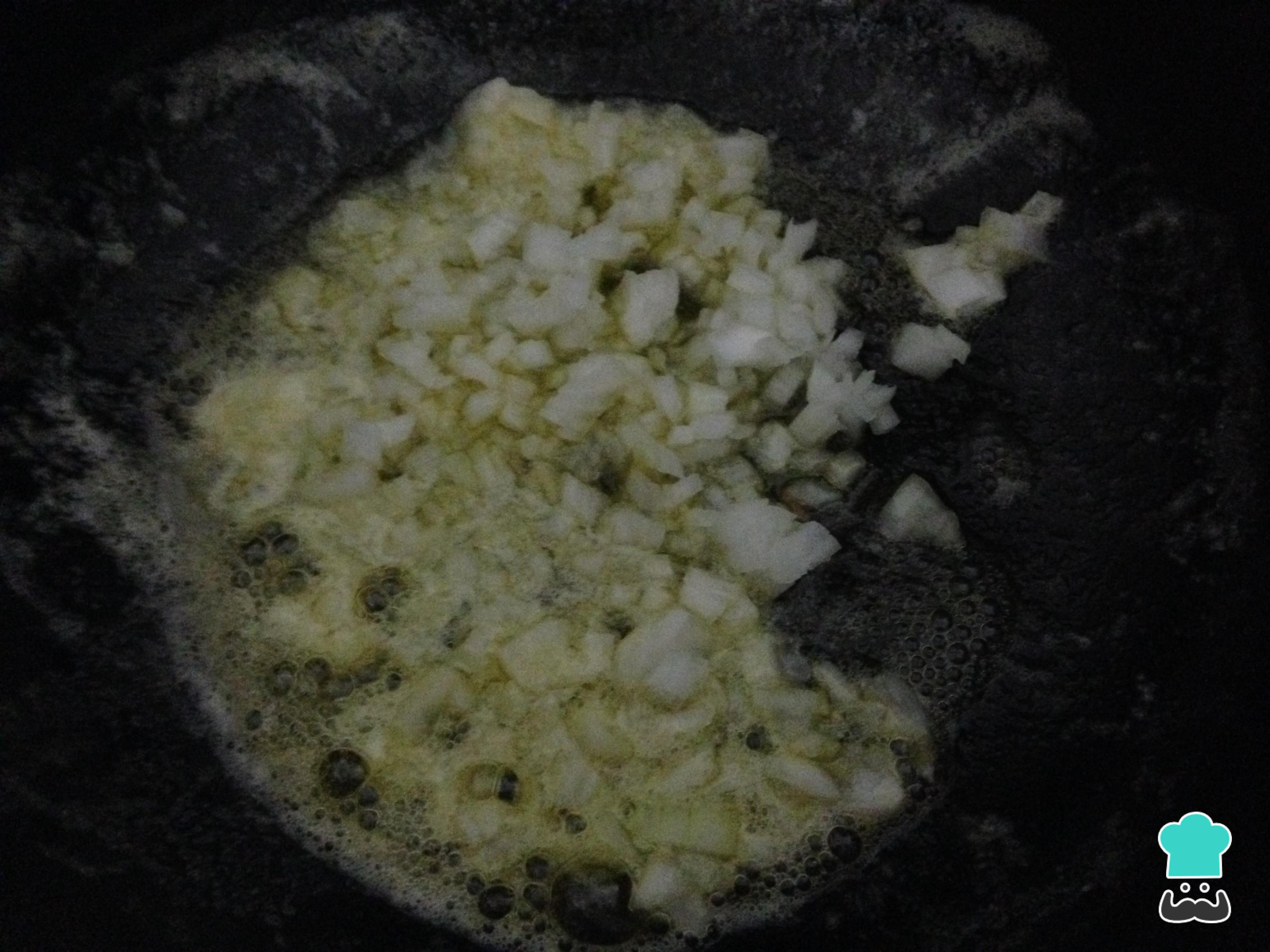 Numa frigideira bem quente, cozinhe a cebola picada finamente junto com a manteiga.