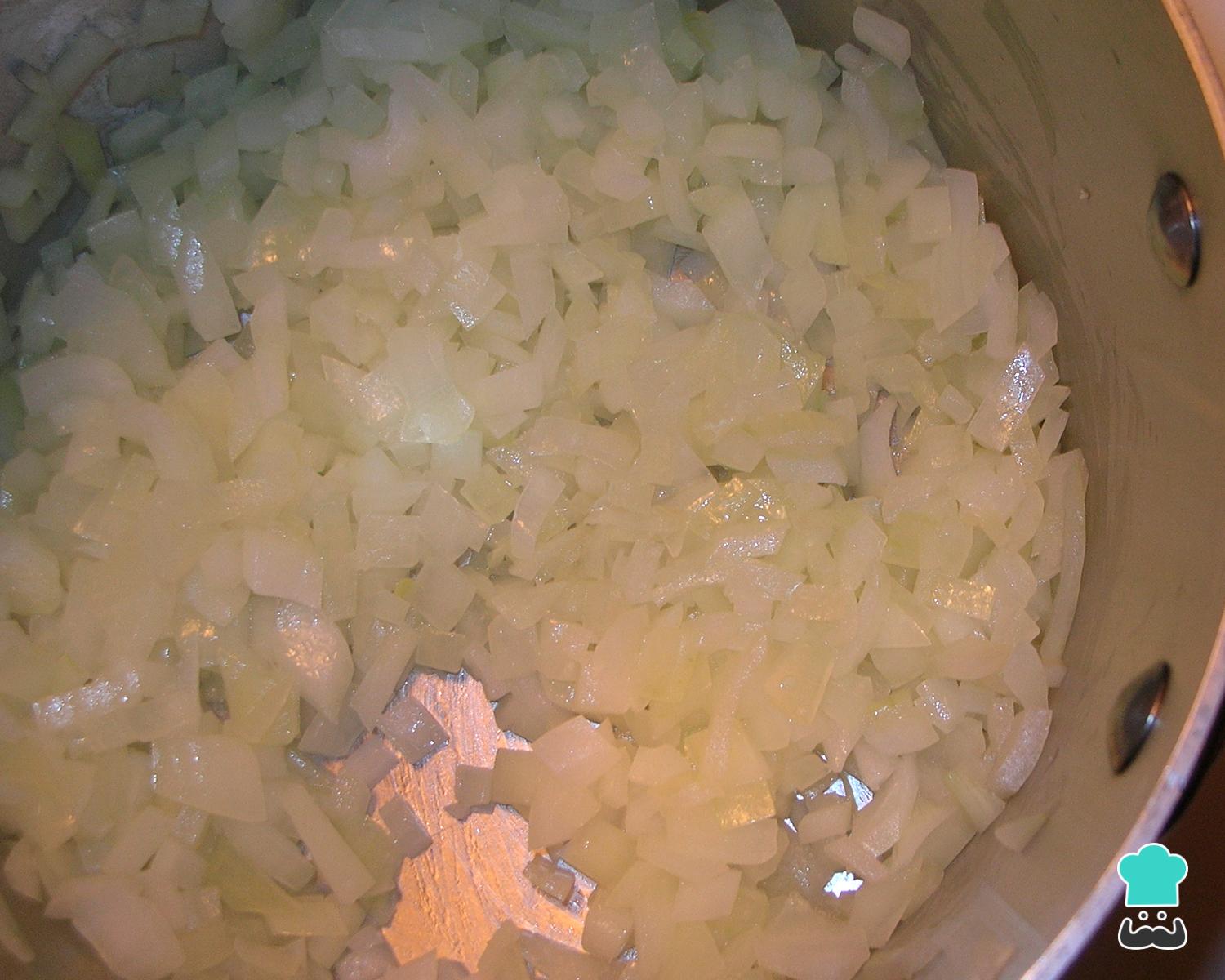 Noutra panela refogue a cebola picada no azeite. Quando a cebola murchar junte a couve-flor picada e o alho, misture e refogue por 1 minuto.