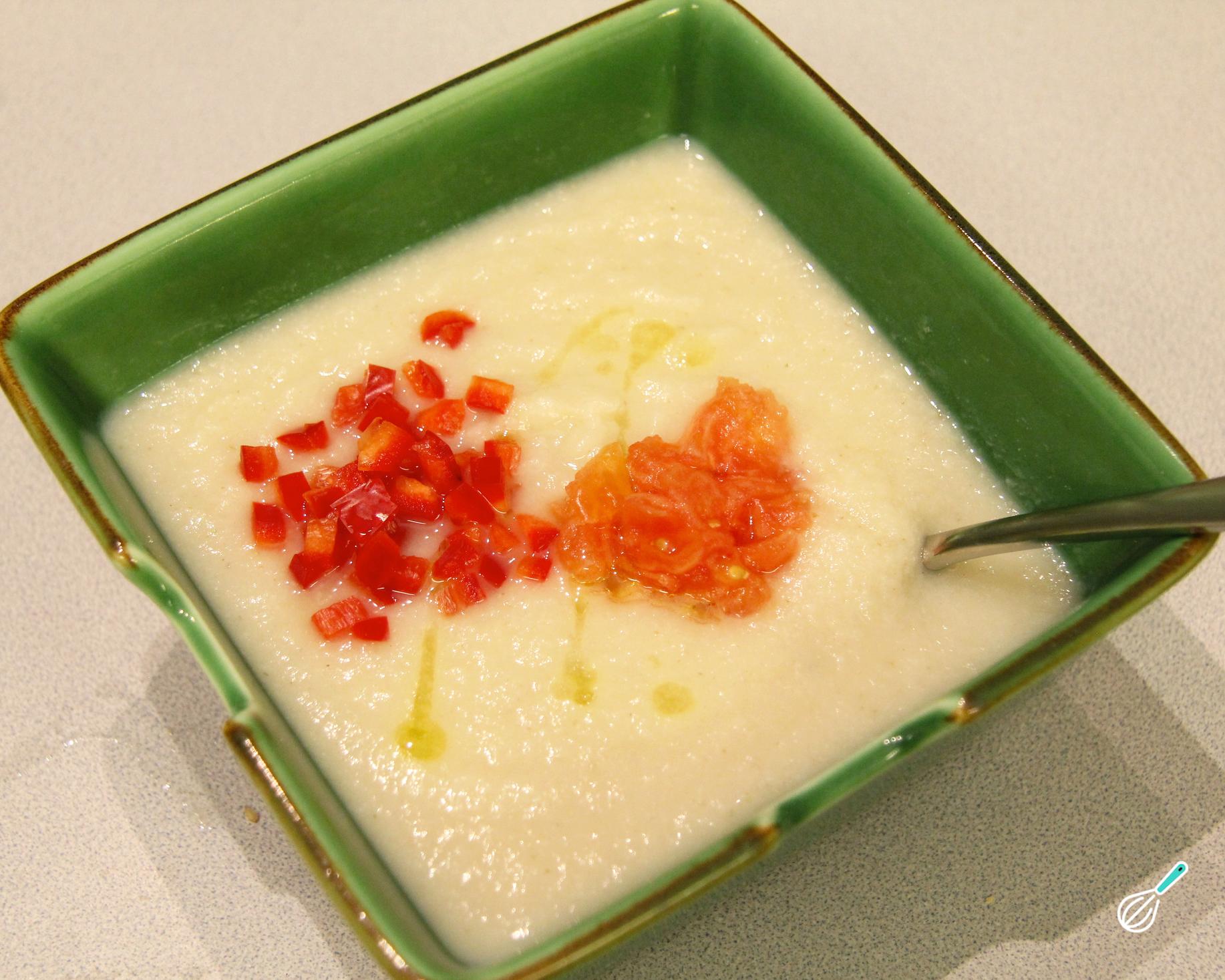 Depois do passo anterior bata a sopa de couve flor com um mixer de pão ou no liquidificador até virar um creme. Tempere com sal e pimenta a gosto, coloque a linguiça e espere ferver novamente.
