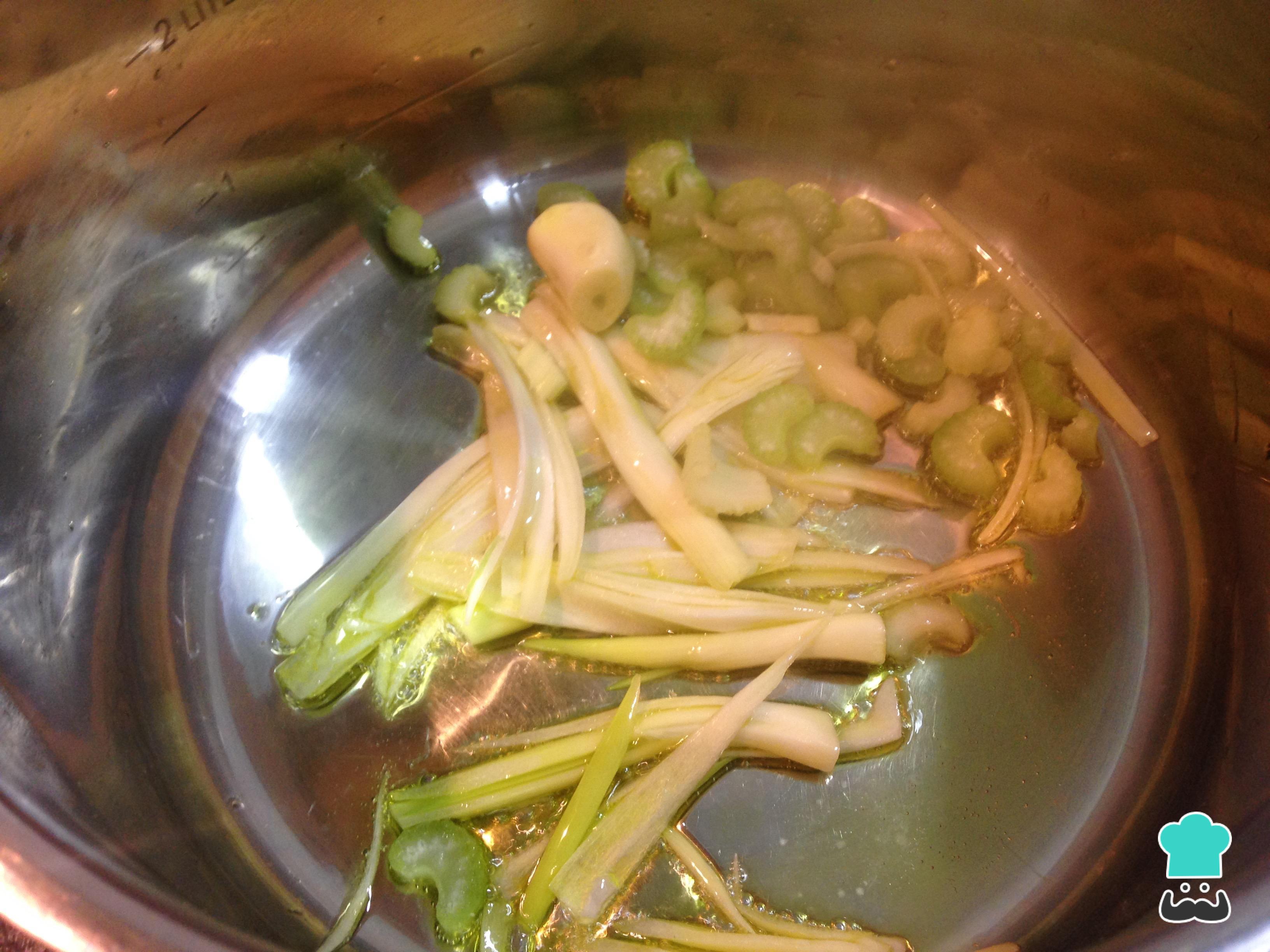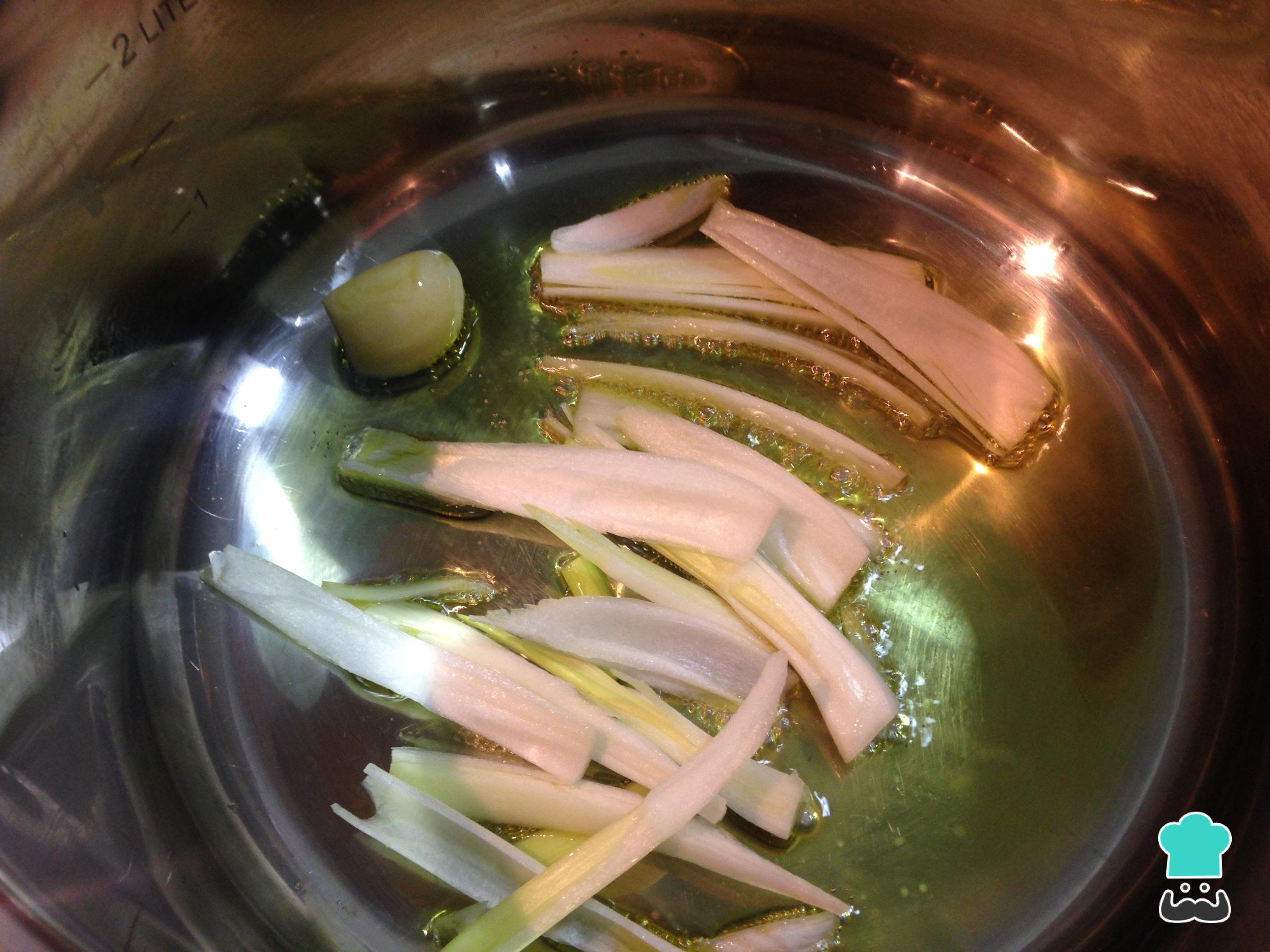 Em uma panela com o azeite, refogue por 3 minutos a cebolinha-verde cortada em tiras e o alho descascado e inteiro.