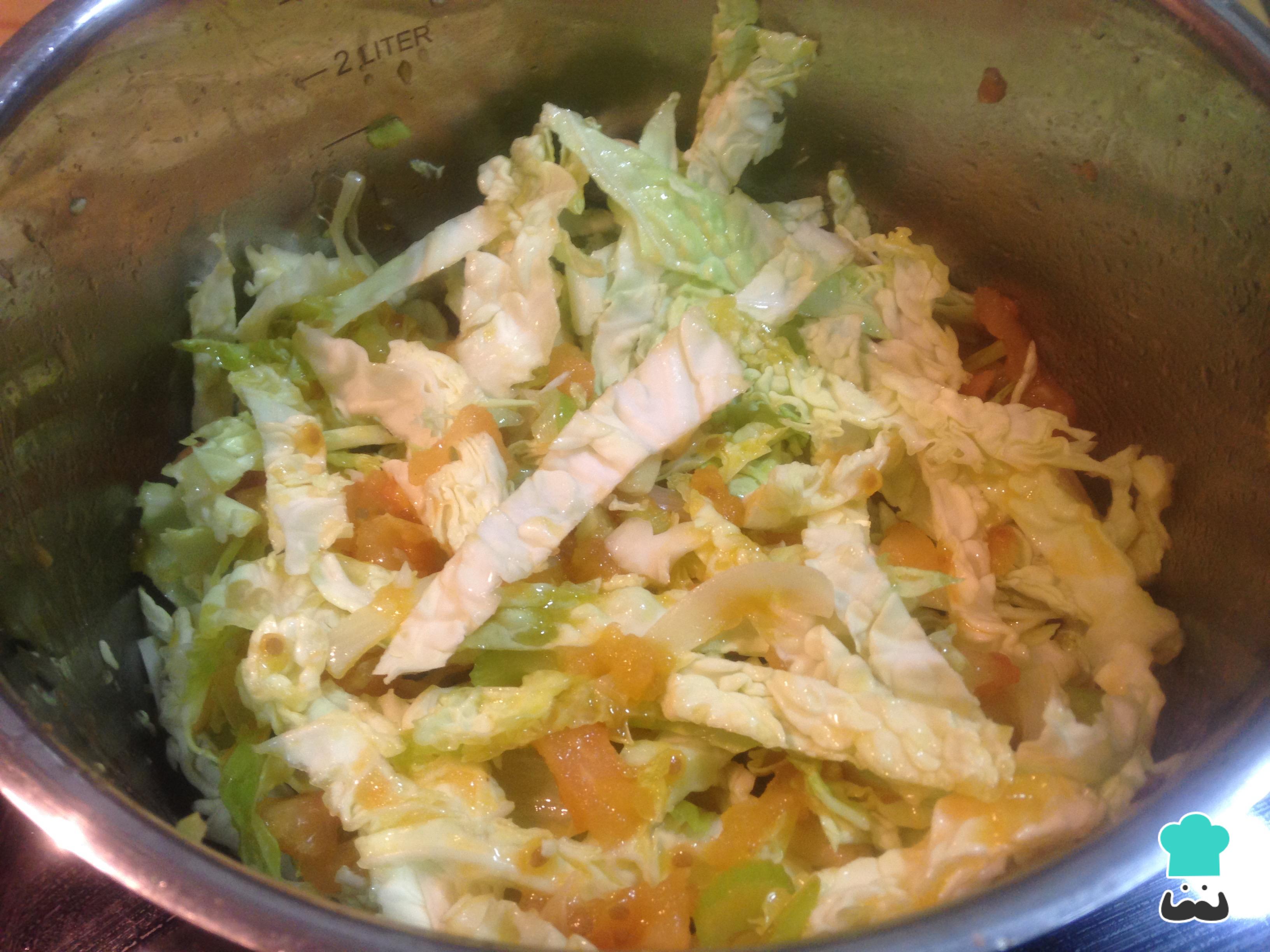 Finalmente adicione o repolho cortado em tiras e misture com os ingredientes da panela. Deixe o repolho cozinhar por 5 minutos, cubra com caldo de legumes ou água, e deixe cozinhar por 20 minutos, ou até o repolho ficar tenro.