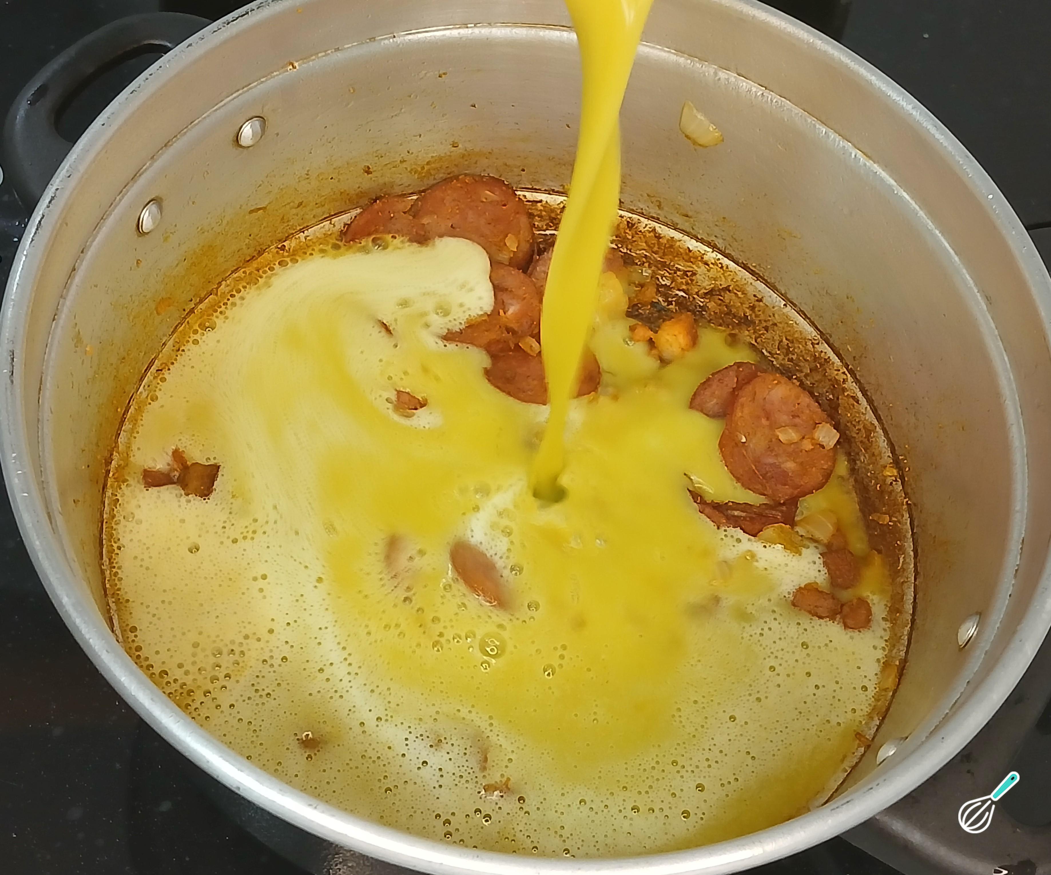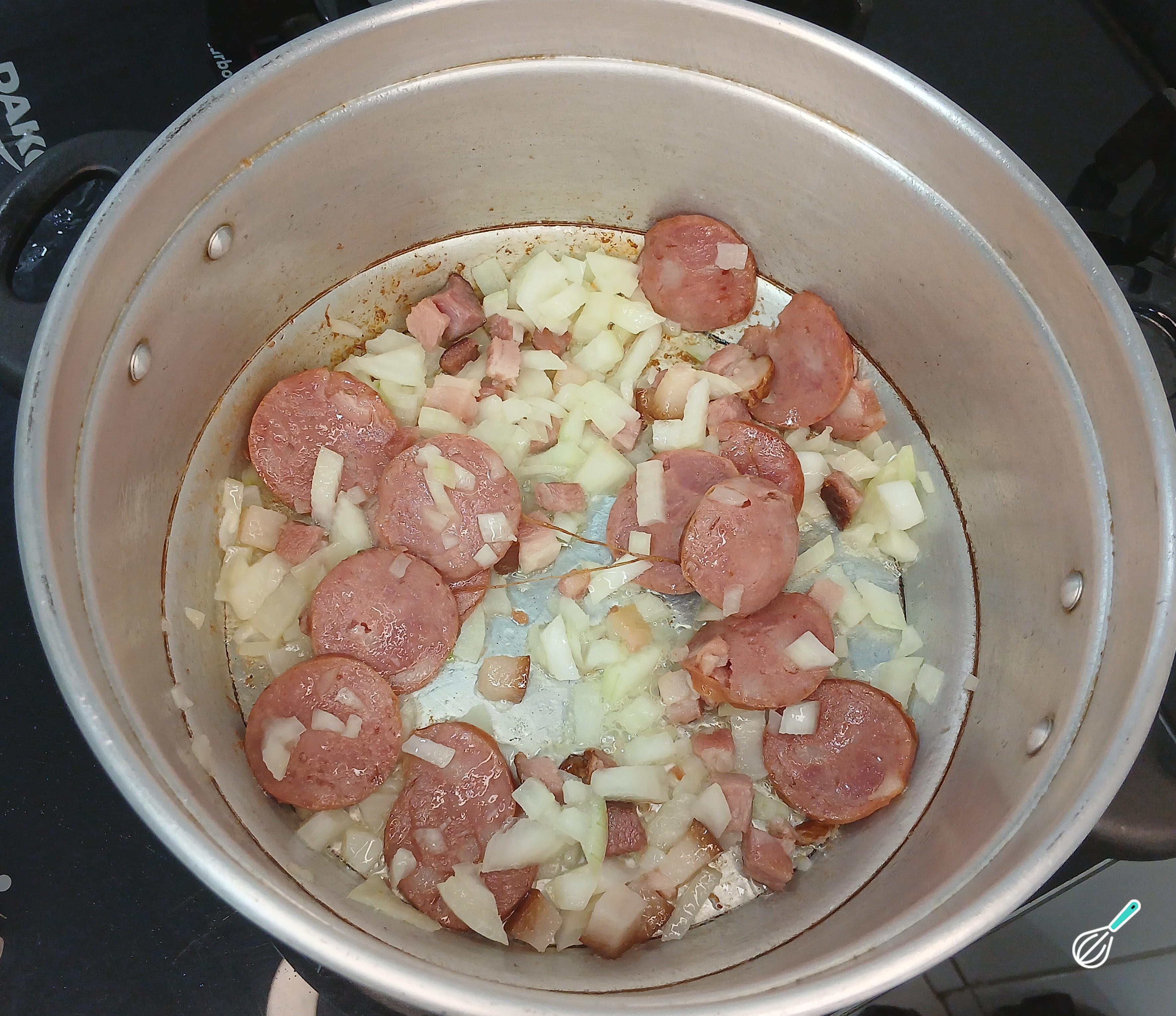 Depois, em uma panela média coloque óleo e adicione a calabresa e o bacon, deixe fritar. Assim que estiverem fritos, entre com a cebola branca cortada e deixe fritar e refogar um pouco. Mexa com uma colher de pau, para evitar que grudem ao fundo. Mantenha o fogo baixo.