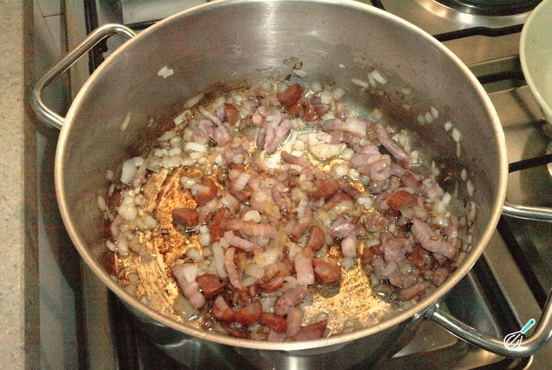 Continue o preparo da sopa de ervilhas cortando agora as fatias de bacon, a cebola e o alho em pedaços pequenos. Leve a refogar com o azeite na panela onde preparou as ervilhas, em fogo baixo, até dourar.