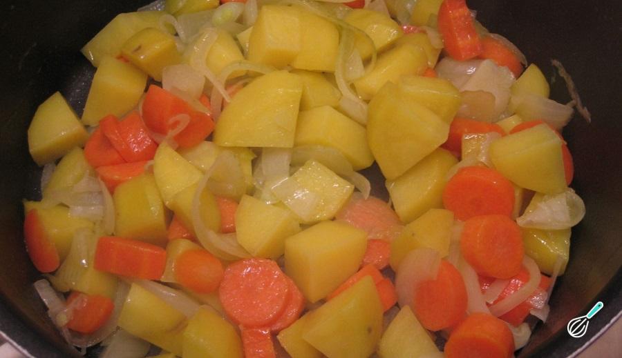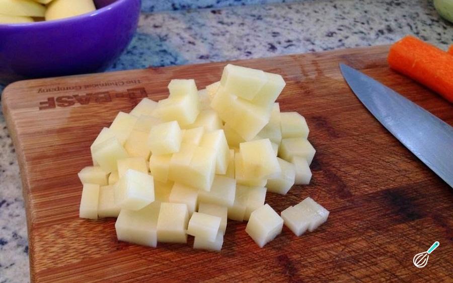 O primeiro passo para preparar a sopa de feijão é descascar a batata, a cenoura e a cebola. Corte em cubos médios esses três legumes e o tomate também.