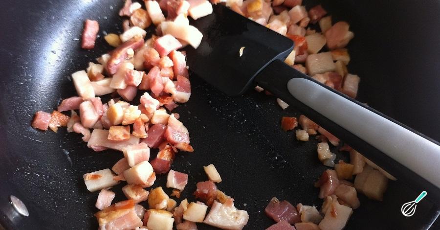 Corte o bacon em pedaços e, numa frigideira, frite na própria gordura. Quando estiver dourado, acrescente à sopa junto com o restante feijão. Tempere com sal e cheiro verde e cozinhe por mais 10 minutos.