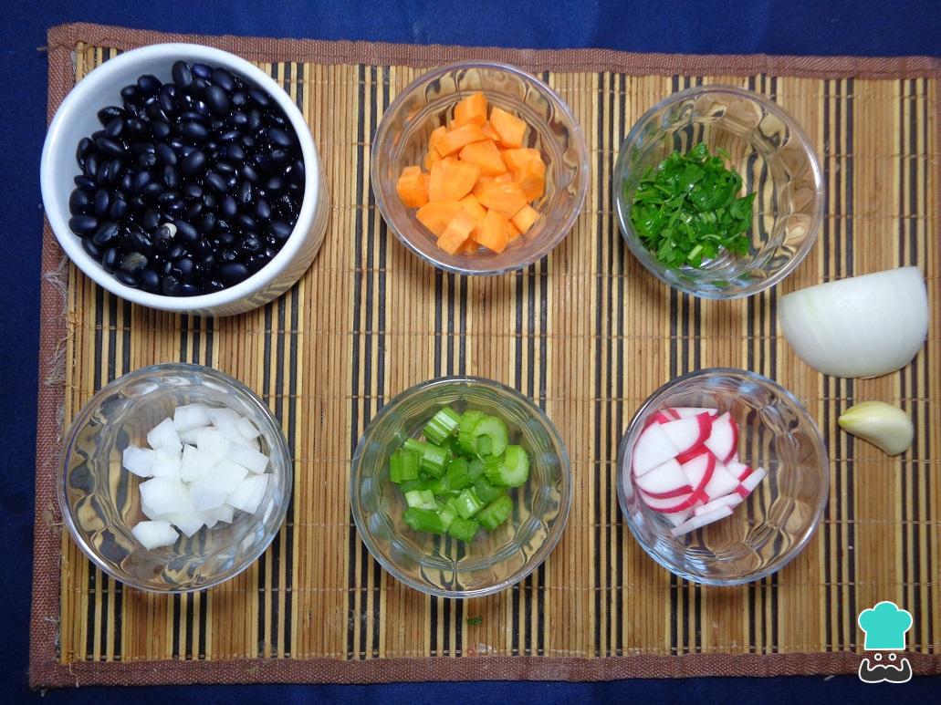 Comece essa receita de sopa de feijão preto reunindo os ingredientes necessários. Como pode ver escolhemos ingredientes bem light para que esta sopa seja o mais saudável possível.