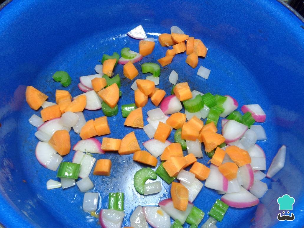Quanto isso leve ao fogo uma outra panela com um pouco de azeite e cozinhe nela a restante cebola, o aipo e o rabanete, até que fiquem macios e dourados. Tempere com sal e pimenta a gosto.