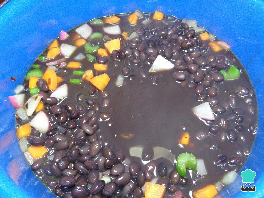 Em seguida lave e limpe o feijão. Coloque em uma panela com bastante água, um pouco de sal, o alho e metade da cebola e cozinhe até que fique macio.