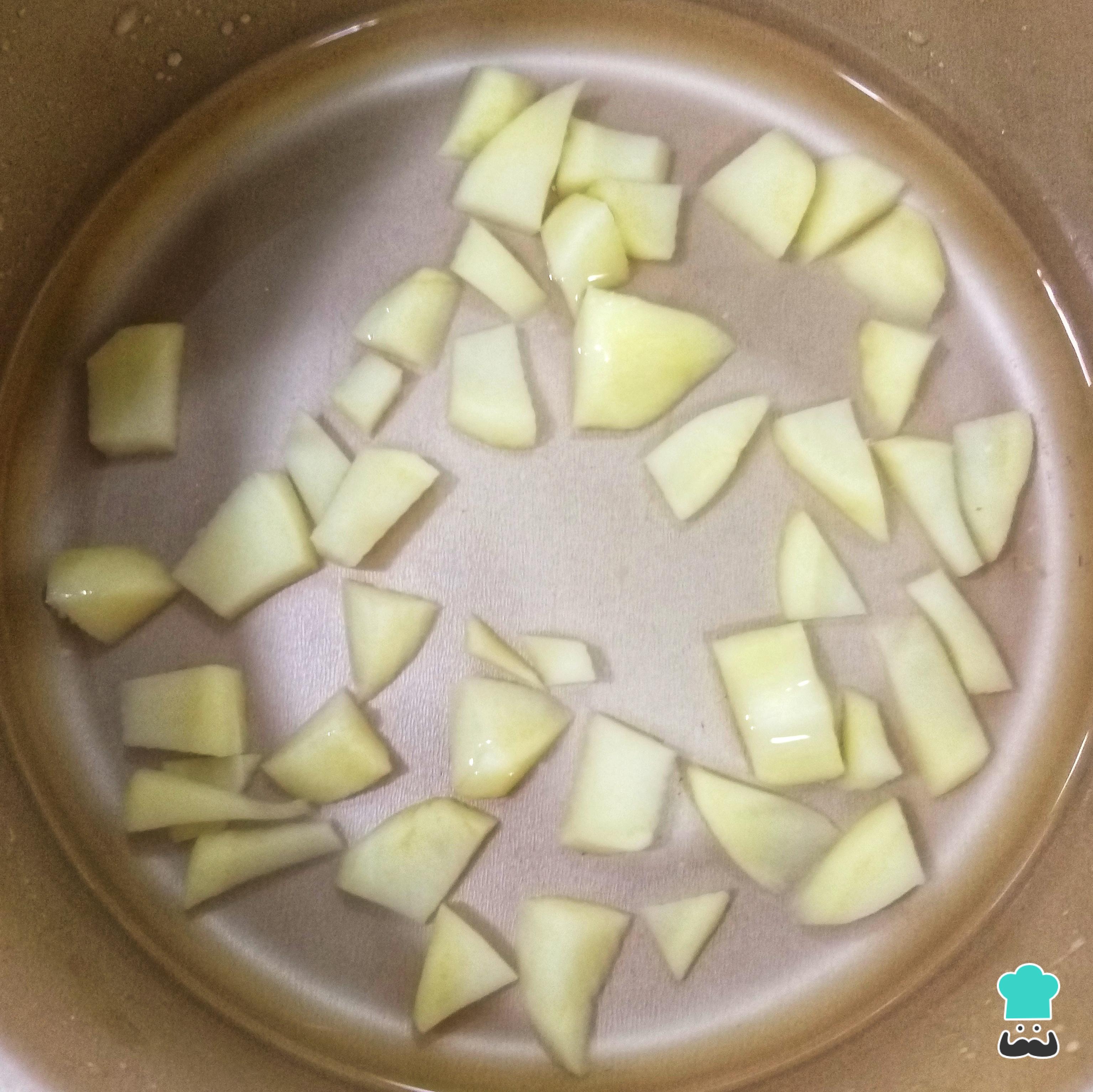 Corte a batata descascada em cubos pequenos e leve ao fogo médio com água o suficiente para cobri-las. Cozinhe até que as batatas fiquem macias e reserve.