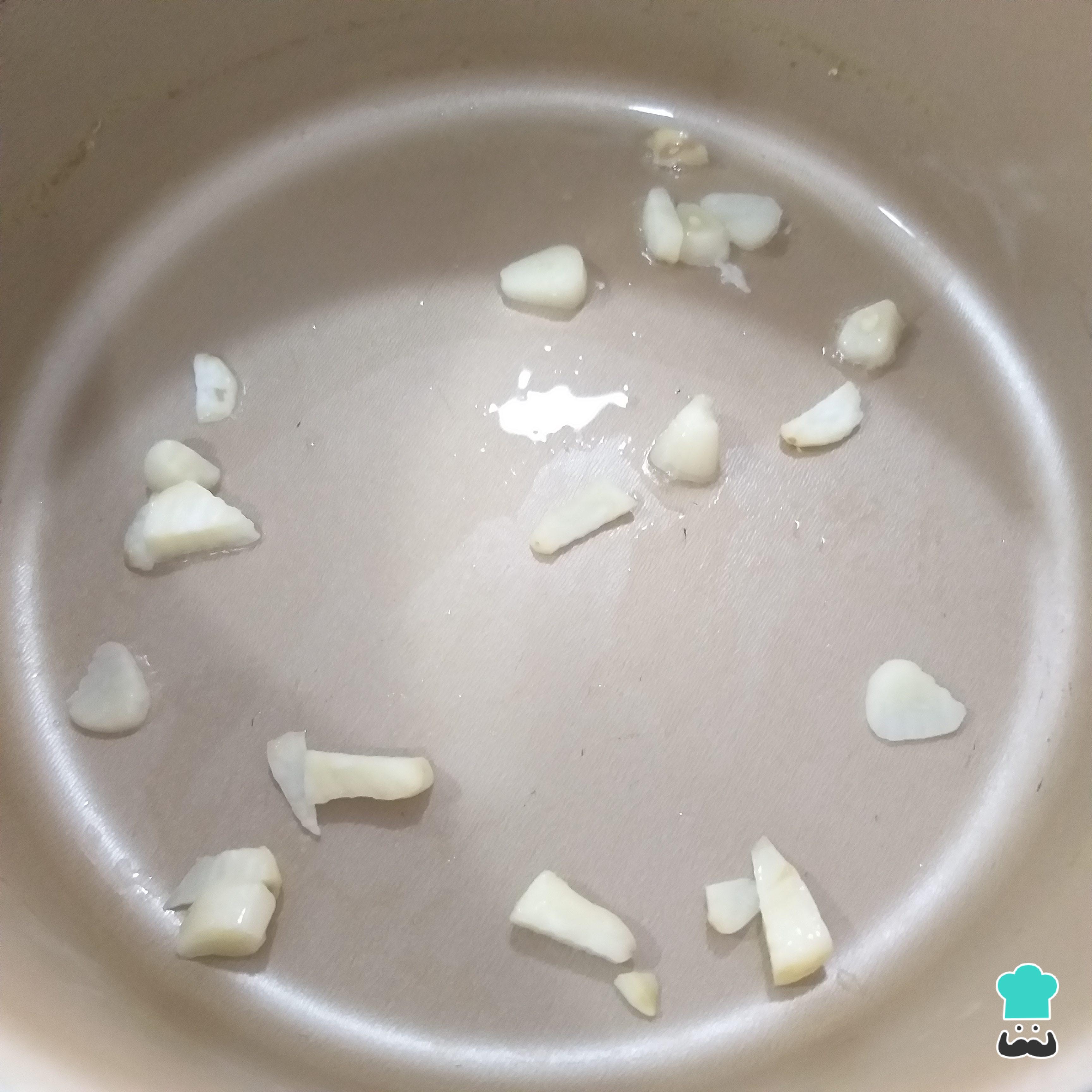 Em outra panela coloque o óleo e os dentes de alho descascados e cortados. Refogue em fogo baixo, mexendo de vez em quando, para não deixar os alhos queimar.