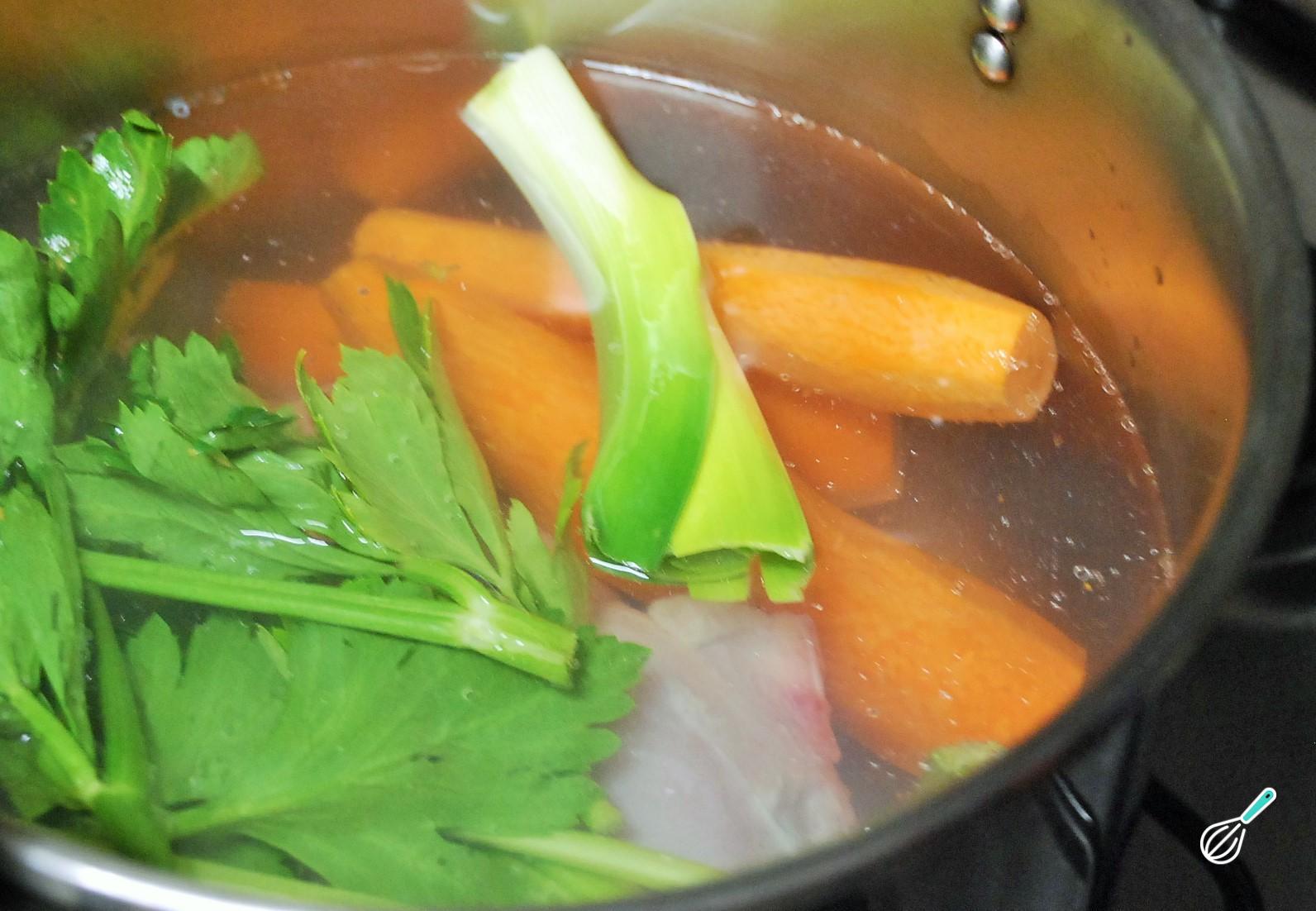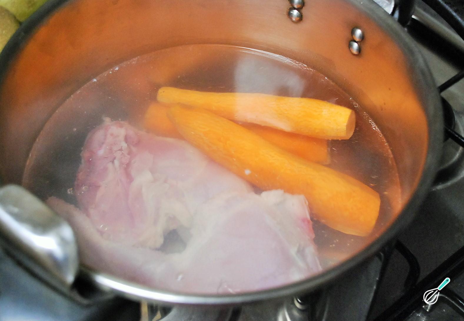 Encha uma panela de pressão com água suficiente para cobrir todos os legumes e cozinhe em fogo alto. Adicione primeiro o frango e as cenouras.